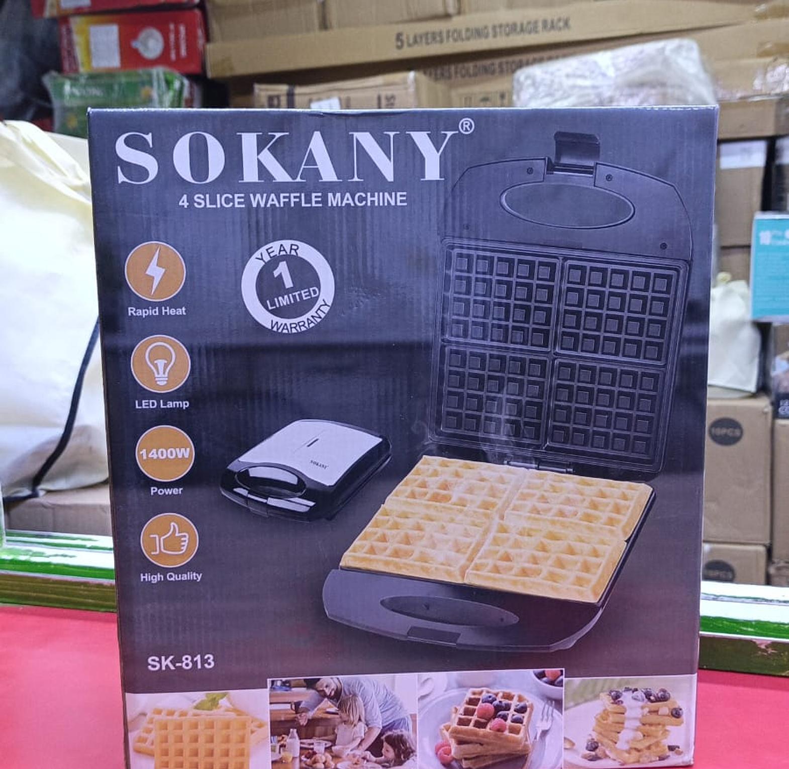 This appliance is designed for making up to four fluffy, golden-brown waffles at a time. It features non-stick coated plates for easy release and cleaning, as well as power and ready indicator lights for convenient use. The design includes a cool-touch handle and a locking latch for safety during operation and storage.