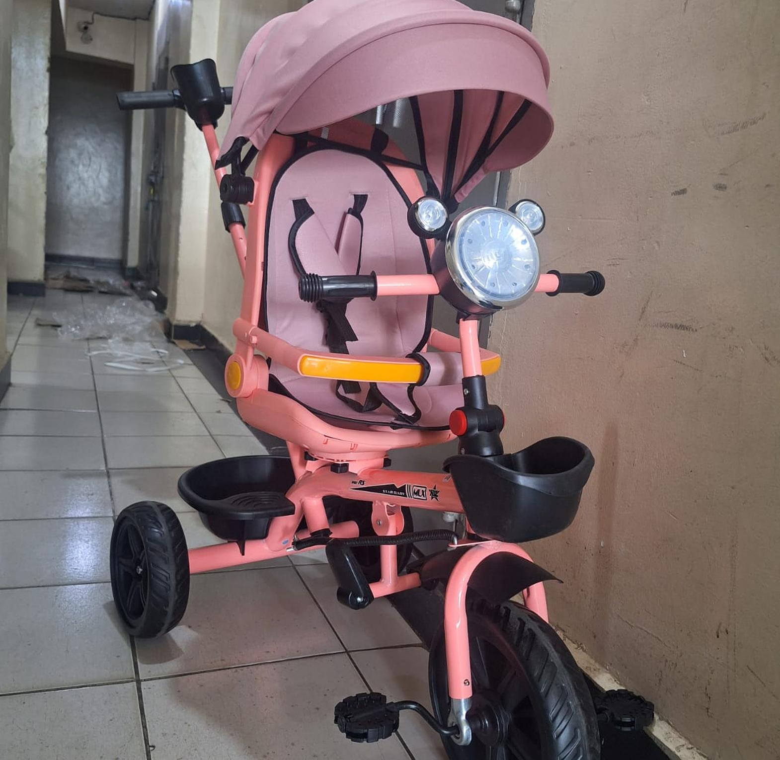 This type of product is designed to grow with a child, transitioning from a parent-controlled stroller for toddlers to a pedal-powered tricycle for older children. The model shown is pink, has a canopy, a parent push handle, and various safety features.