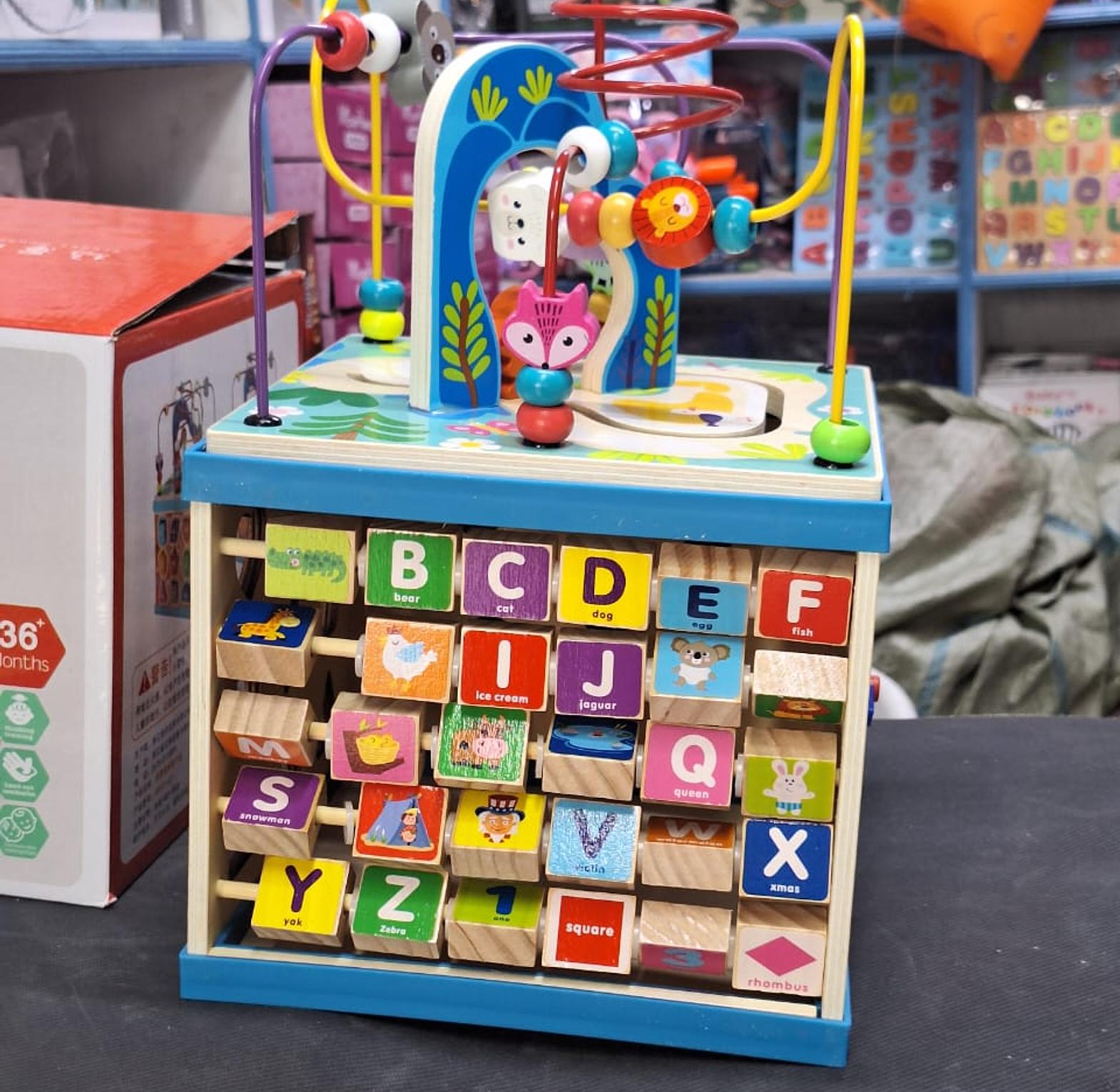 It is designed as a space-saving educational tool that integrates several developmental games into a single, compact unit