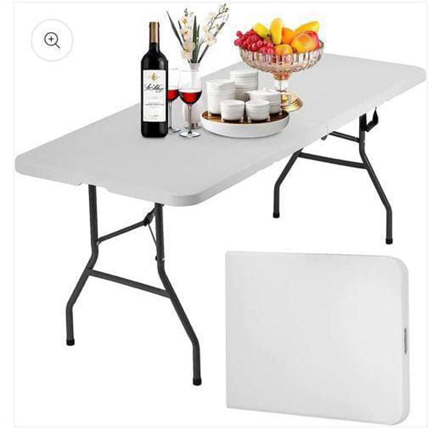 VERSATILE USAGE: Use it as a dining table for outdoor cookouts, game table for poker nights, or serving table for backyard birthday parties FOLDS AND LOCKS: Foldable design, side lock, and handle make it easy to take on the go or store away in a closet when not in use DURABLE TABLETOP: Strong plastic tabletop has an easy-to-clean surface that is able to hold food, drinks, and various other items STURDY SUPPORT: Powder-coated steel legs and non-slip rubber feet help to keep the table in place during every event