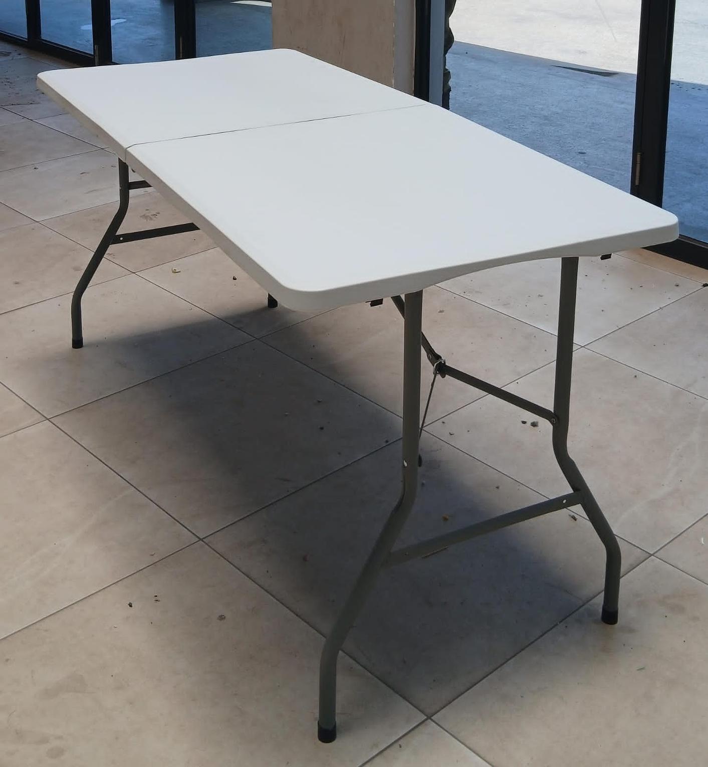 Material: The tabletop is typically made from high-density polyethylene (HDPE) plastic, which is waterproof, stain-resistant, and easy to clean. The frame and legs are constructed from durable, powder-coated steel for stability and rust resistance. Design: It features a foldable design where the legs tuck in and the table often folds in half down the center, transforming into a compact format for easy storage and transport. Some models include a built-in carrying handle. Durability: The materials are weather-resistant and UV-protected, making the table suitable for various environments without cracking, peeling, or fading.