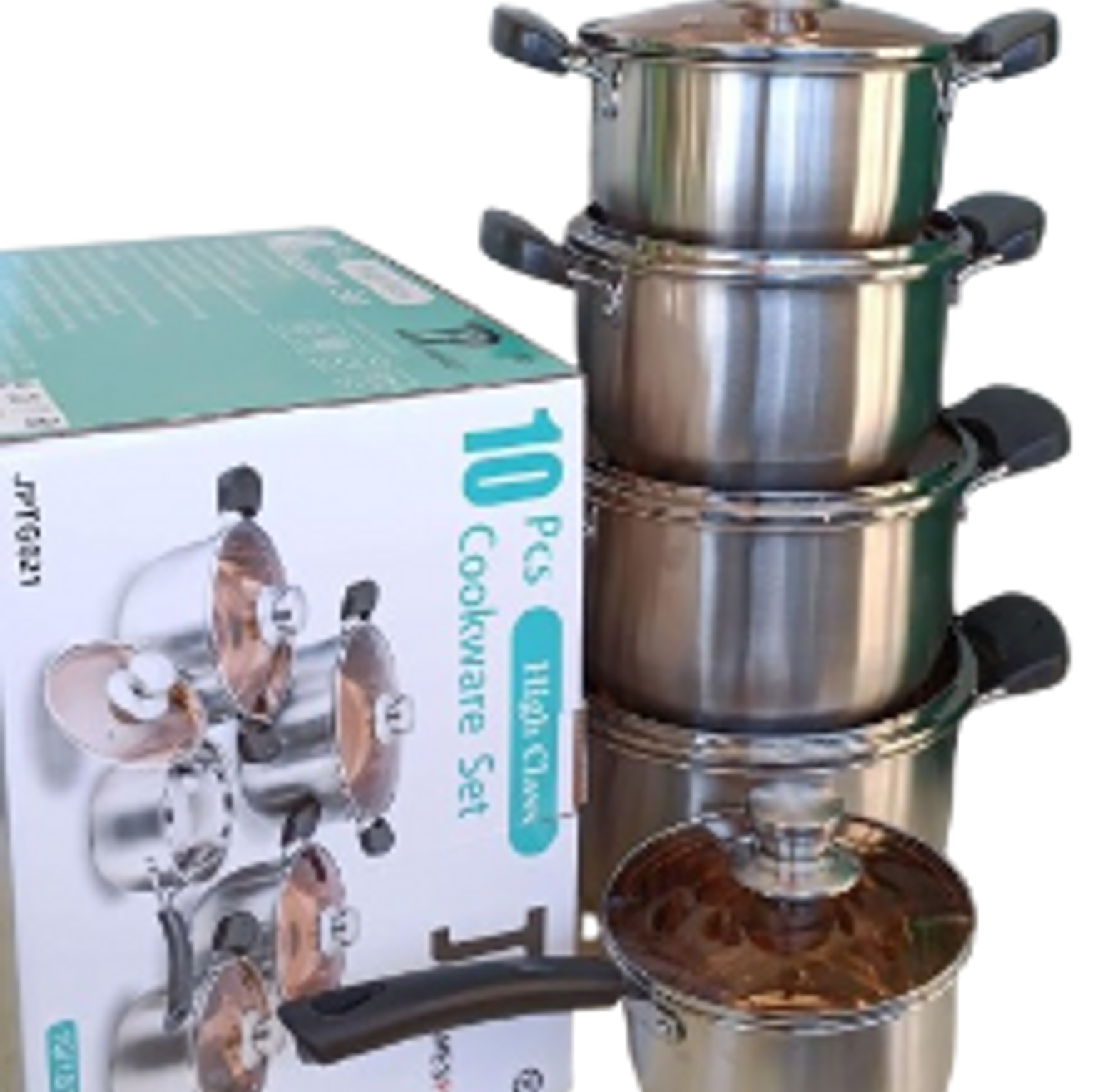 This 10 -Piece Cookware set is made of and pure aluminum encapsulated in the base for fast and even heating and optimal cooking performance. Tight-fitting covers seal in moisture and nutrients for healthier, more flavorful results, every time you cook. Solid stainless steel riveted handles stay cool on the stove top