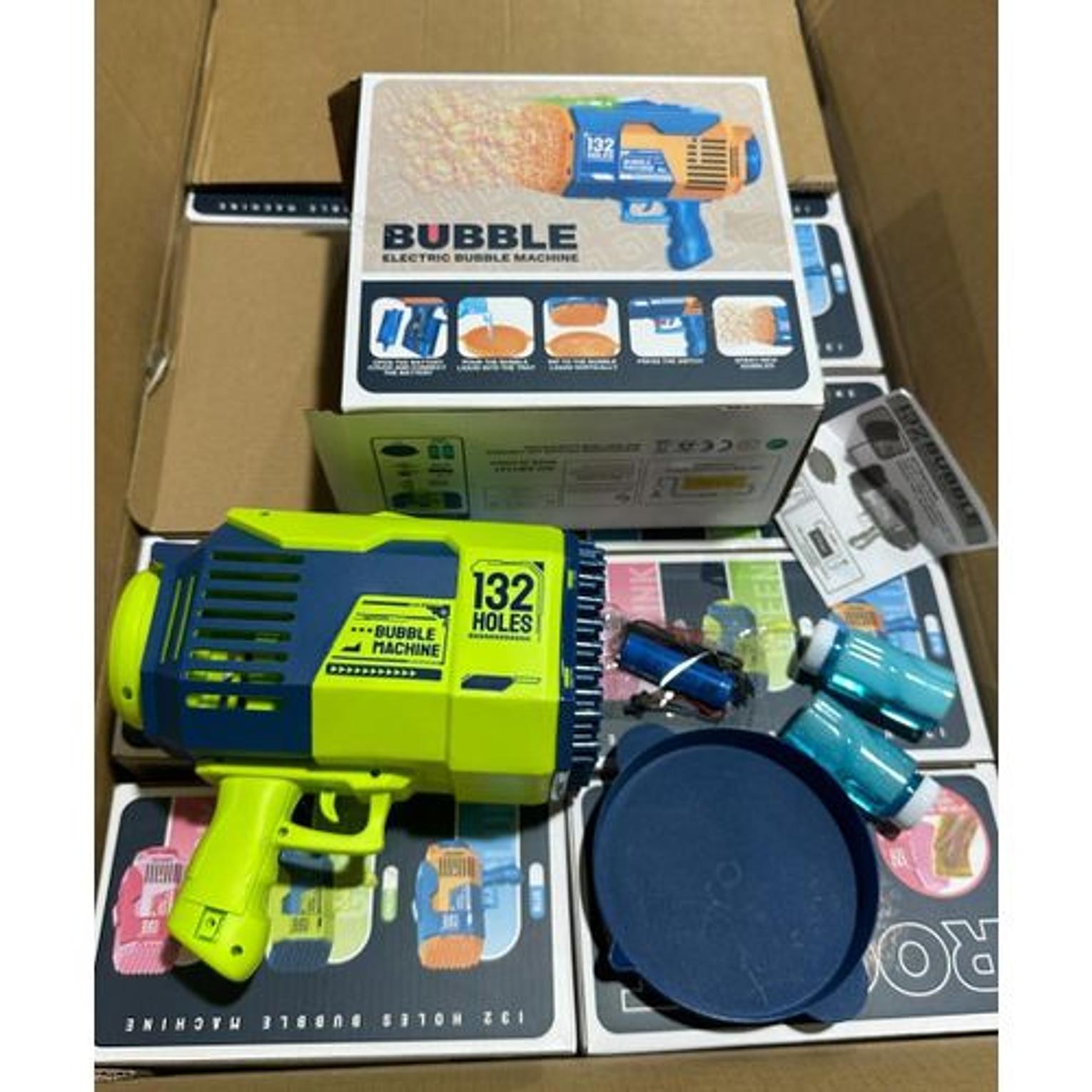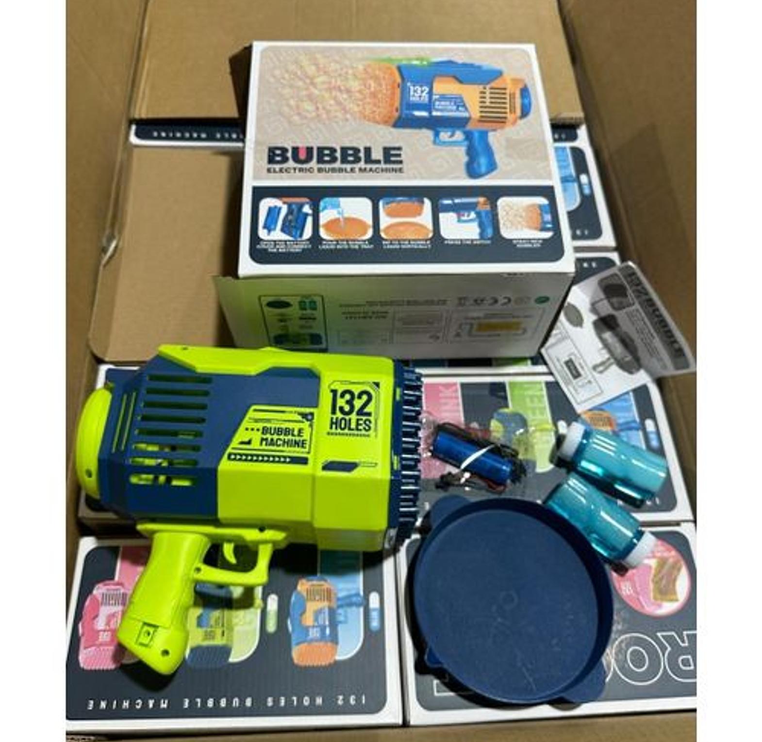 The Bubble Blaster Machine has 132 holes and produces so many bubbles per minute. It is lightweight and easy to hold. So much fun for you and friends. Also has a bright light to make the bubbles light up. Easy to use, and lasts for hours. Made with high quality ABS plastic material, and has an easy to grip handle. This will be a hit for so many different occasions. This creates a fun and enjoyable atmosphere for Wedding Receptions, Birthdays, BBQ's, or backyard get togethers with friends, and all kinds of indoor and outdoor activities. Comes with two bottles of bubble solution, a rechargeable battery and wire, and its own solution tray that easily allows you to dip in the bubble gun to create more bubbles for your party.