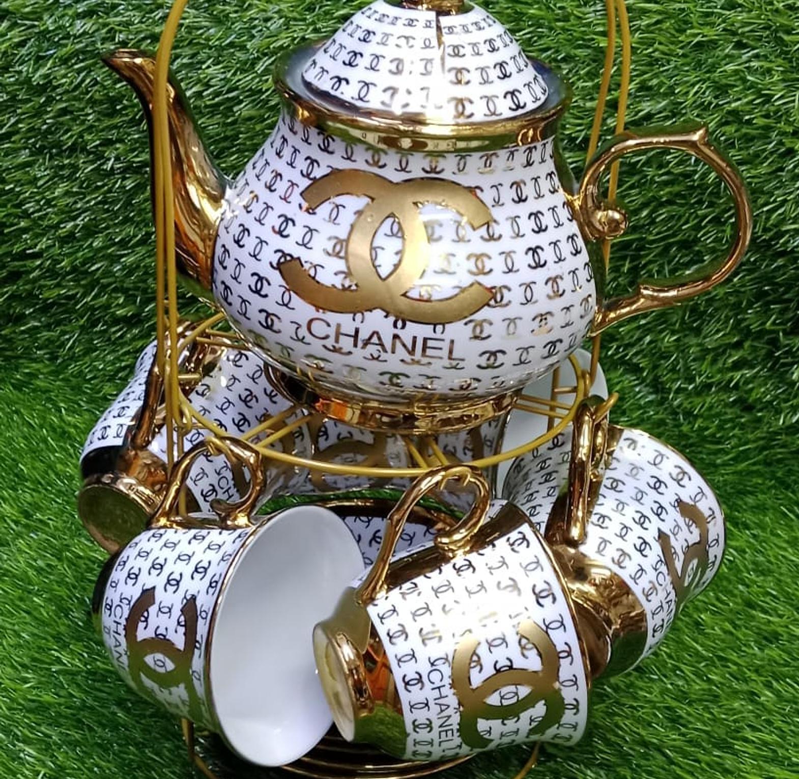 This tea set typically includes a teapot with a lid and multiple cups, often accompanied by saucers and a stand for display and storage. The set features a white and gold color scheme with prominent "CHANEL" branding and the iconic interlocking C logo repeated across the surfaces of the teapot and cups. The teapot has a capacity of around 500ml, and each cup holds approximately 100ml. The set is designed for serving tea and can be used for decorative purposes or for hosting tea gatherings