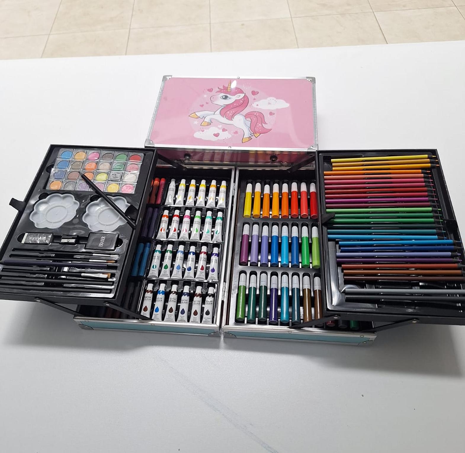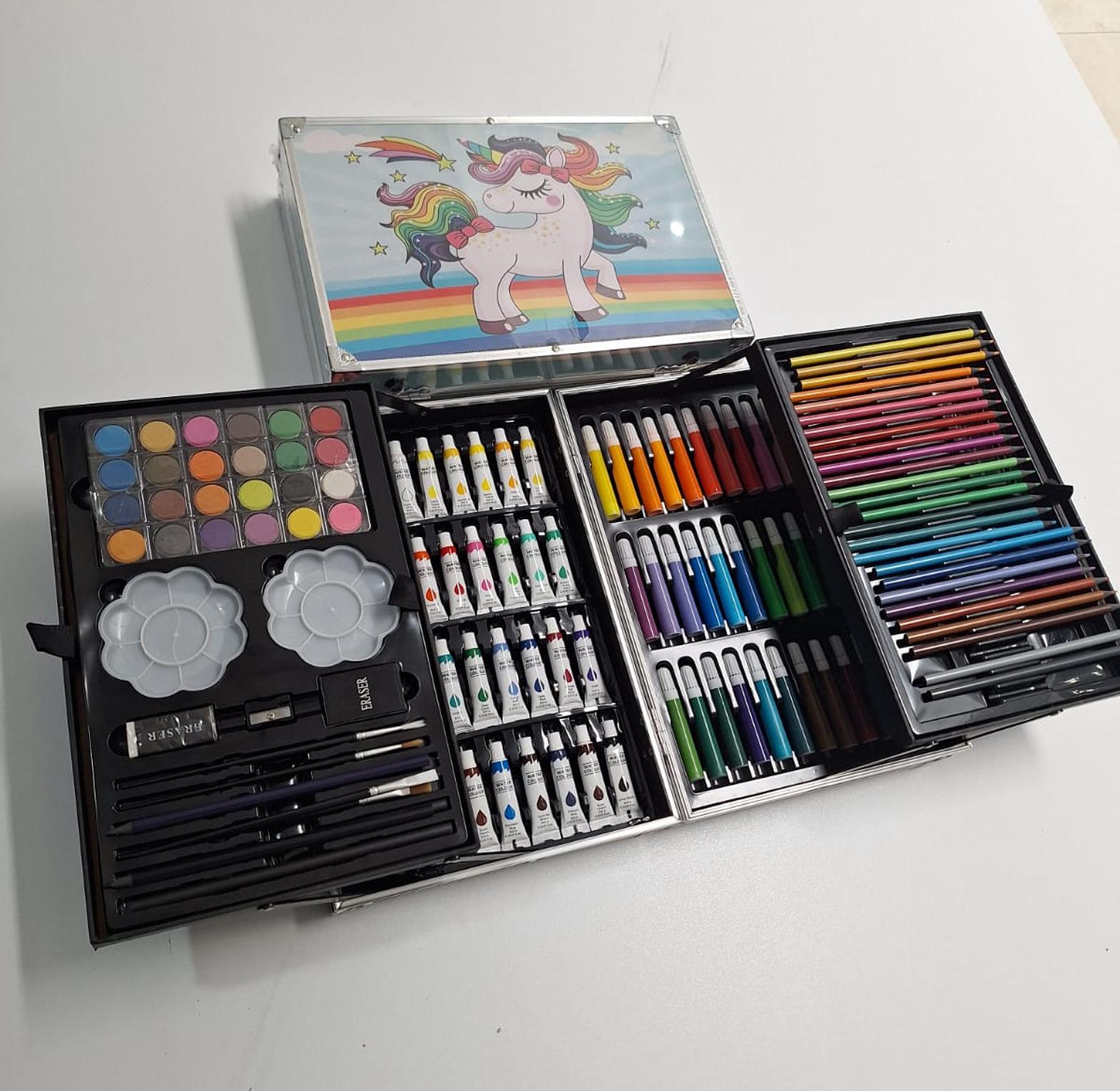 This all-in-one art kit includes 145 pieces and is the perfect set of tools for any artist, beginner or professional. With a variety of supplies, it’s an art pencil set, art watercolor set, acrylic paint set and more!• This deluxe art set includes a wide variety of art supplies for drawing, painting and more, including plastic palettes, acrylic, oil and watercolor paints, pencils, brushes and much more.• This art box set is the perfect set of tools for any artist, beginner or professional. It can also be used as a kid’s art set, and makes a great gift, too.• This art set with case also includes an aluminum case with a snap-shut handle, to hold all the supplies, keeping them neat and organized.• Includes small parts, non-toxic, conforms to ASTM-D, not for children under 3 years. DESCRIPTION: Develop Your Kids' Talent: This art set is helpful for developing kids' creativity, logical thinking, hand-eye coordination, and problem-solving ability.
