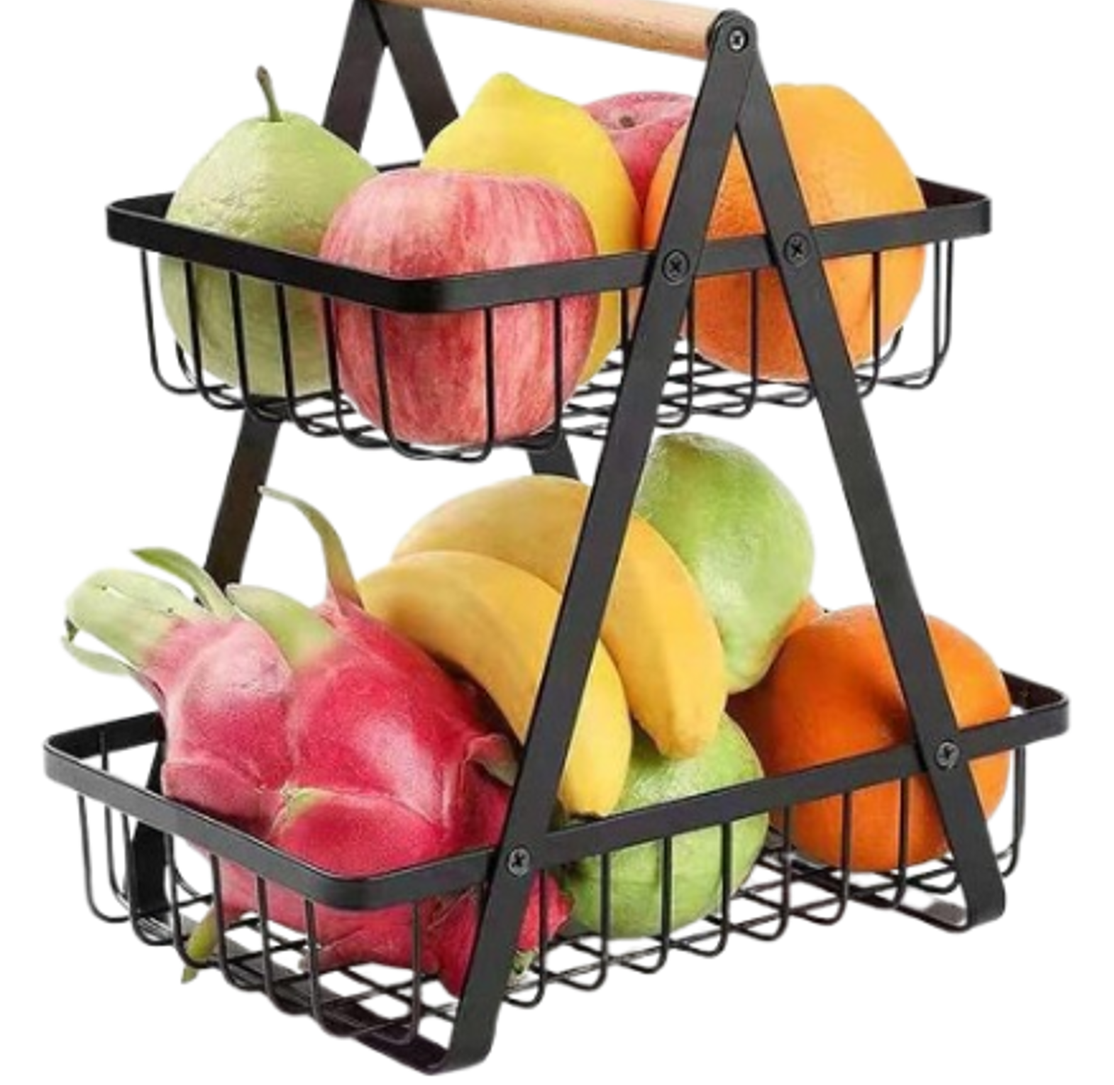 2- tier detachable fruit/multifunctional basket perfect for everyday use in the kitchen, bathroom, pantry, etc. Great for entertaining in the dining area, buffet, restaurant, indoor / outdoor area - Gorgeous accent piece in modern and traditional spaces. The versatile 2 tier fruit basket can be removed into two separate baskets for a single serving tray and placed on the desktop. The swirl scroll basket looks stunning and attracts everyone. The bowl is used for household storage and is an open design, so that the fruits ripen evenly The fruit holder is easy to assemble without tools, which saves a lot of valuable time. Simply screw each rod to each step and attach the larger lower basket to the smaller upper basket