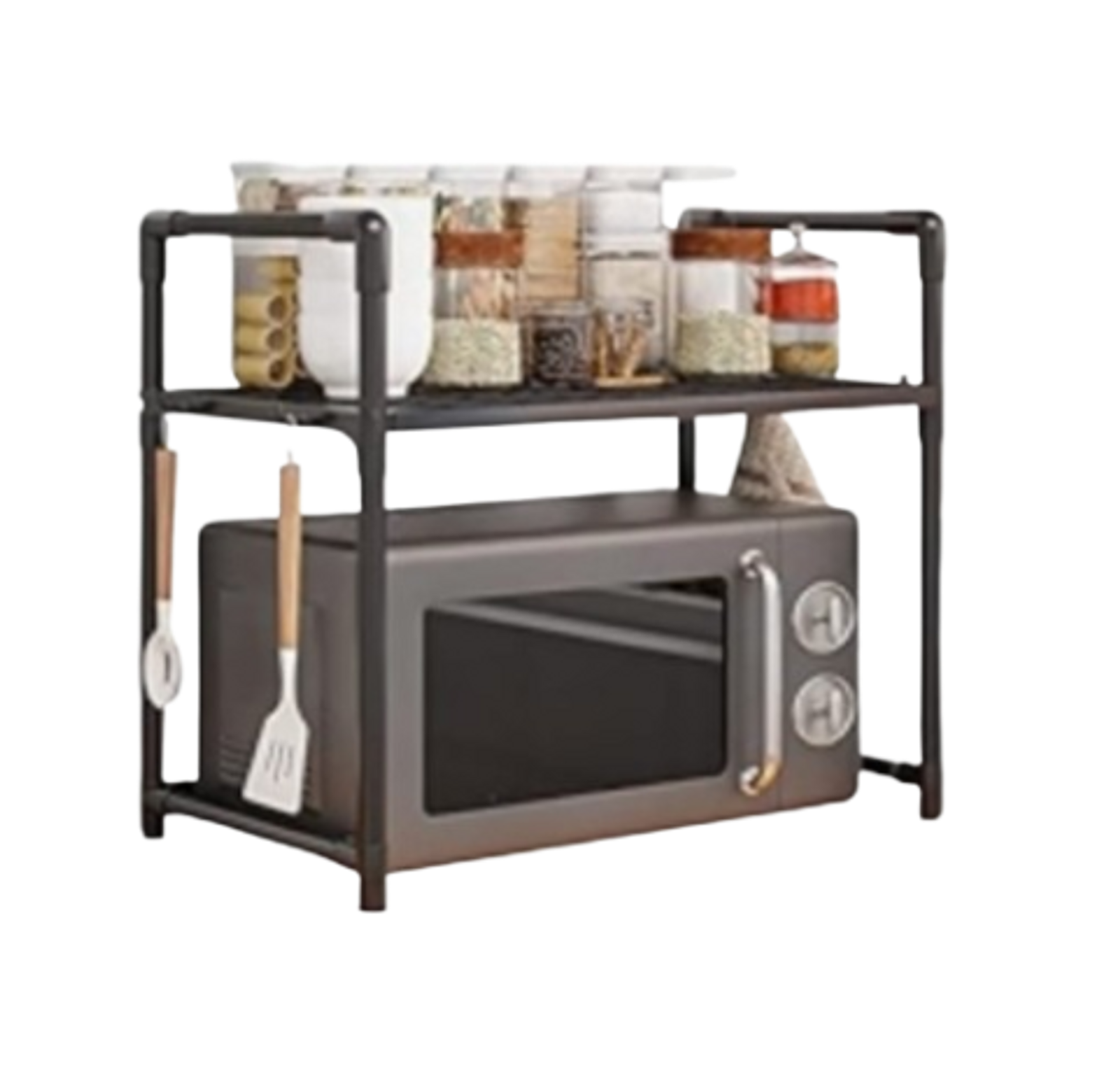 Easily installable and cleanable on any flat surface, no drilling required. Comes with four adjustable foot pads and three bonus hooks for added convenience. Multi-functional storage shelf made with premium and heat-resistant carbon steel, suitable for use in the kitchen, shower room, wardrobe, garage, and more.