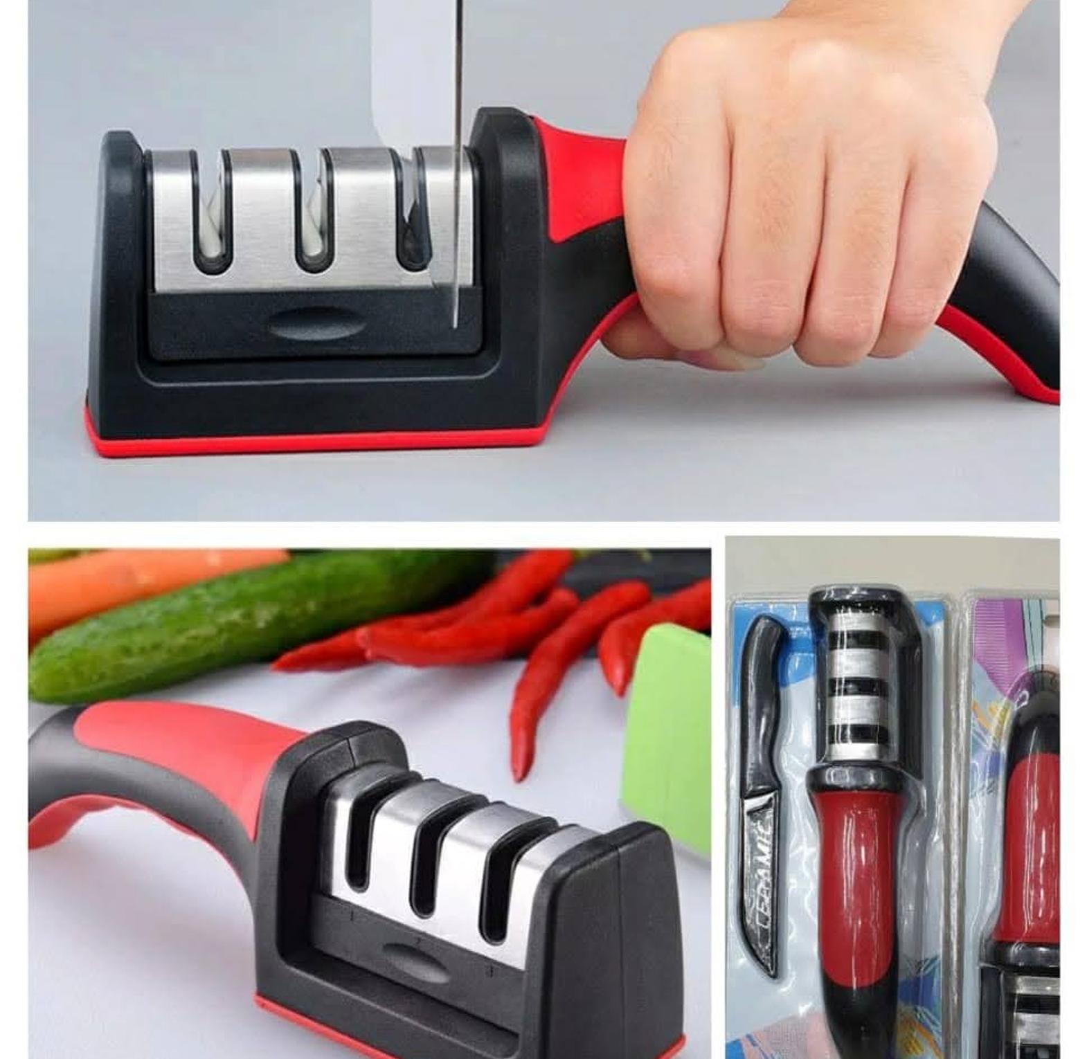 【Three In One Kitchen Knife Sharpener: 】 Our knife sharpener is equipped with three slots, two high-quality materials, tungsten steel and ceramics, with alternating fine grinding, fine grinding, and medium grinding, which can meet different needs within a few seconds Sharpen for cleaning and polishing 【Simple And Easy To Use:】 Just put the blade in the sharpening slot, and then gently pull the knife a few times to sharpen the knife quickly and effectively so that you can restore the cooking knife in a few seconds (Note: Please sharpen the knife in Do not push forward in one direction.) 【Ergonomic Design: 】 Whether you are right-handed or left-handed, the ergonomic handle makes you more comfortable during use! The special curve design of the handle makes the grinding process easy and quick. The silicone non-slip feet also provide firm friction, so you will find it very stable 【Suitable For Most Knives:】 Straight knives used in the kitchen, such as chef knives, utility knives, slicer knives, paring knives, deboning knives, meat cleavers or any other non-serrated blades 【A Good Helper For Kitchen Knives: 】 The product is small in size of only 21x5x5.5cm (8.3x2x2.2in) and can be stored anywhere in the kitchen. It can be sharpened and cleaned and polished quickly when used. It is made of stainless steel + ABS plastic material for more durable