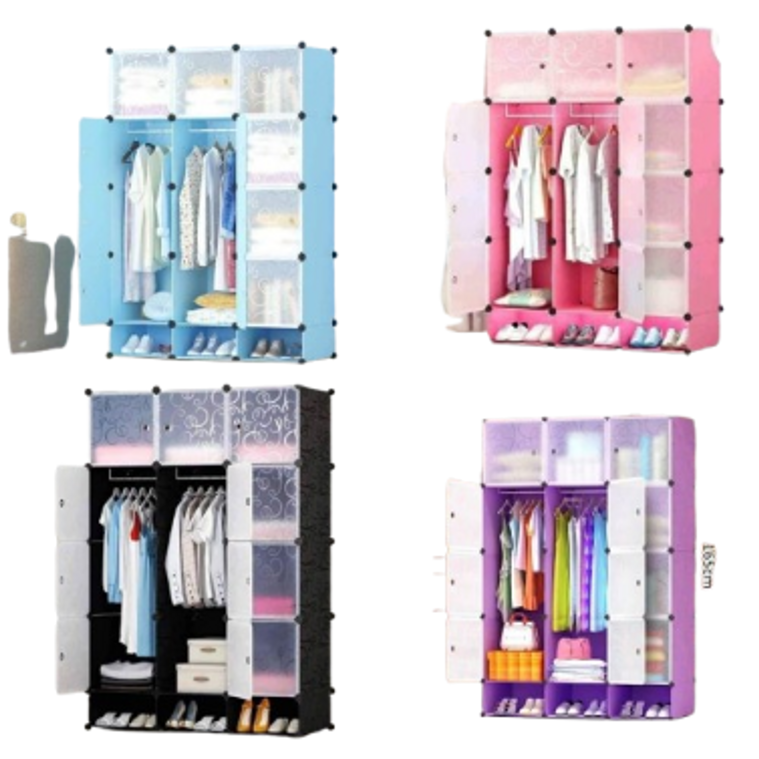 This item is a smart, spacious, and affordable storage solution designed for organizing clothes, shoes, and accessories in various settings such as bedrooms, dorms, or rental spaces. It features a modern, space-saving design and is available in multiple colors including blue, pink, black, and purple, as seen in the image. The design includes dustproof and waterproof doors to keep contents clean and protected.