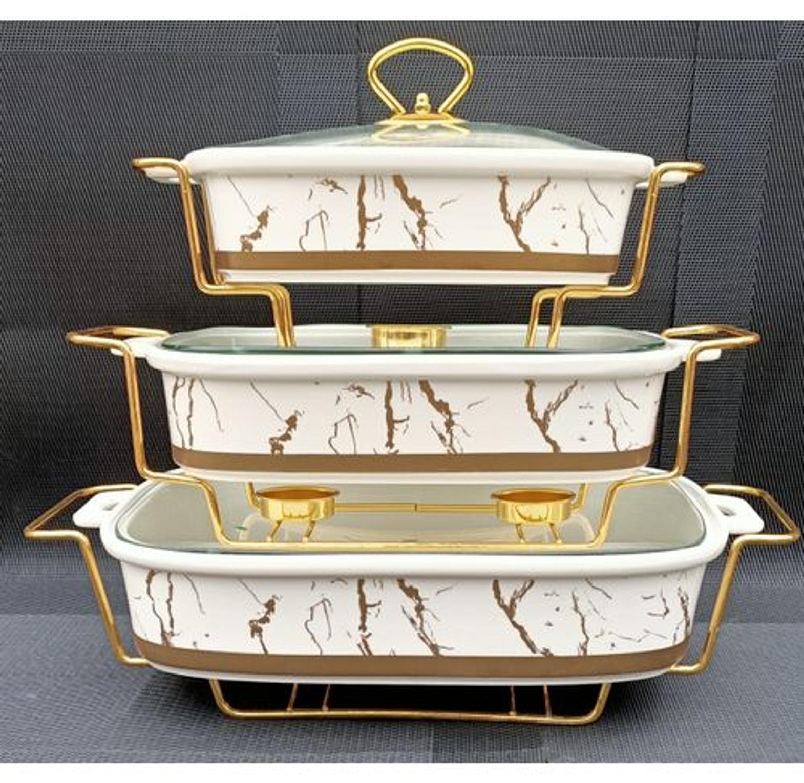 3 Pcs Stylish Serving/Chaffing dishes with burner and lids. Very Classy and beautiful to the eye. Functional and keeps food warm with the burner. Has beautiful lids to keep the food warm. Stable stands to hold the dishes. Easy to use and easy to clean. Hard material to break and easily portable.