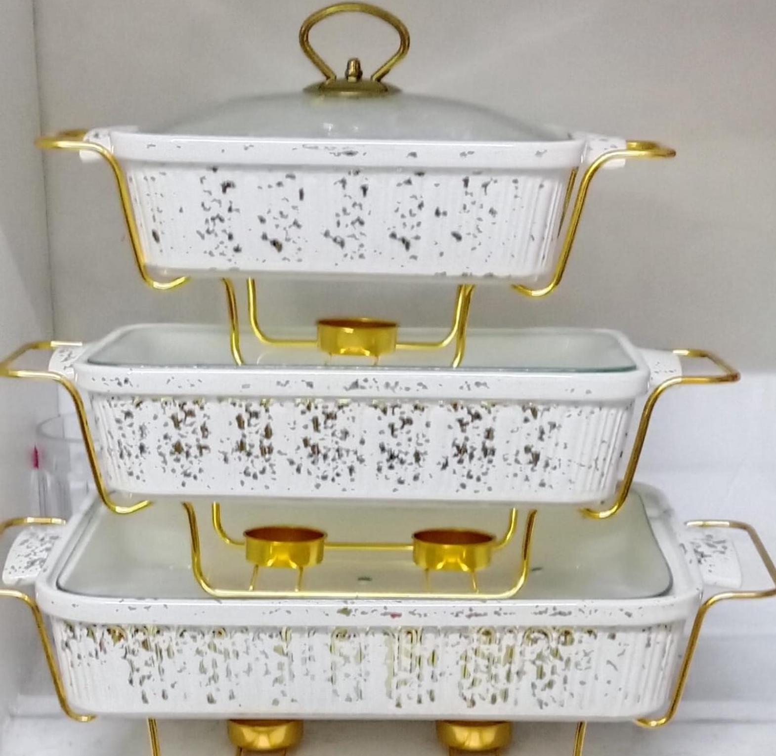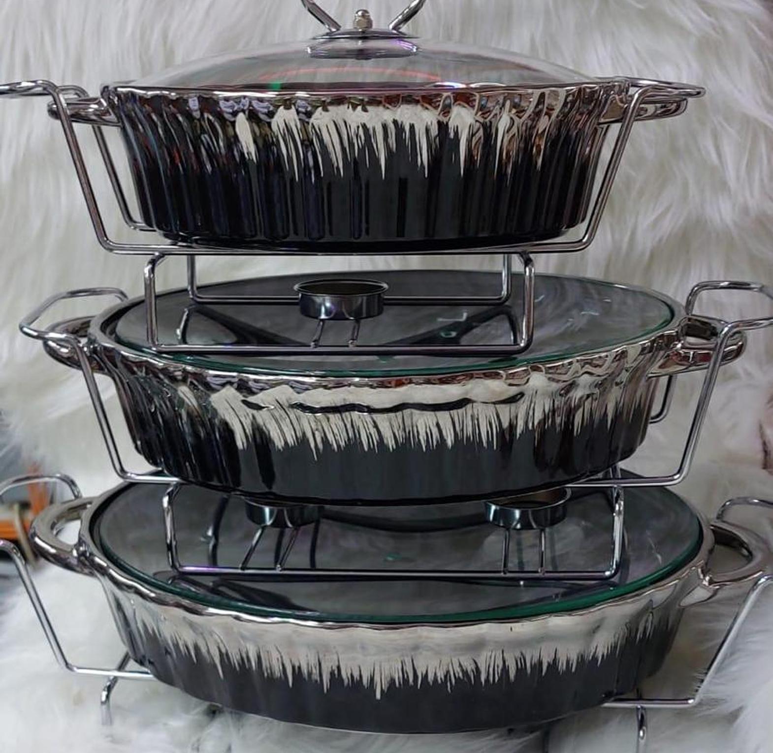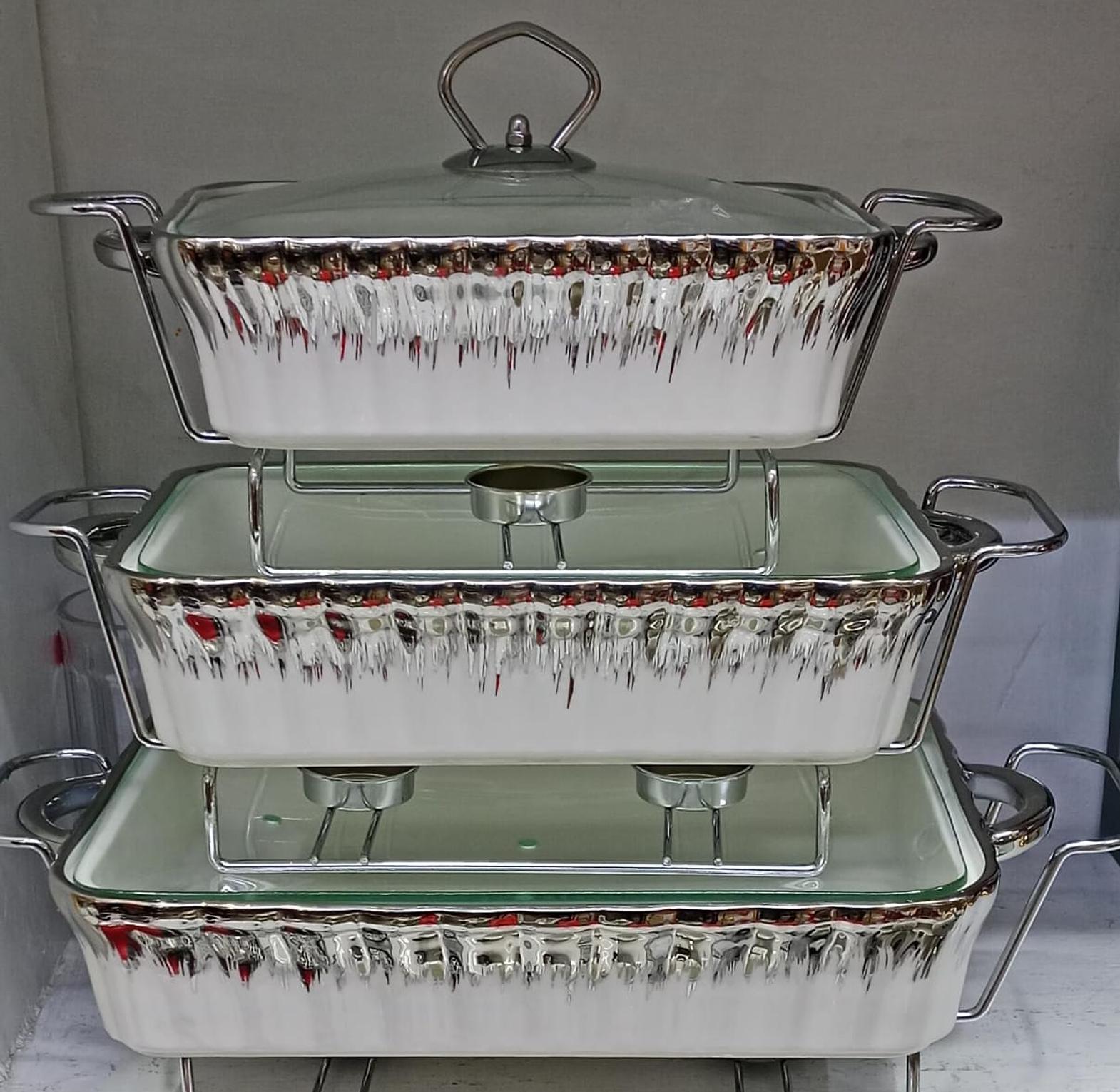3 Pcs Stylish Serving/Chaffing dishes with burner and lids. Very Classy and beautiful to the eye. Functional and keeps food warm with the burner. Has beautiful lids to keep the food warm. Stable stands to hold the dishes. Easy to use and easy to clean. Hard material to break and easily portable.