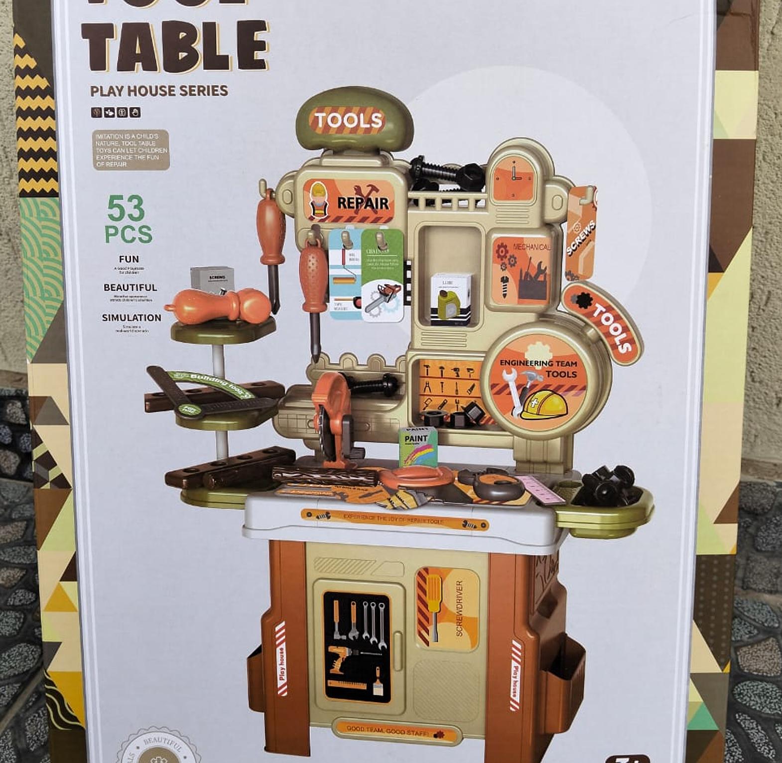"Tool Table Play House Series" by Tanoi Exm. It includes 53 pieces and is designed for children aged 3 and up. The set features a variety of toy tools, a repair station, paint area, and an engineering team tools section. It also has a screwdriver, a crew area, and a storage section. The toy aims to provide a fun, beautiful, and simulation-based play experience.