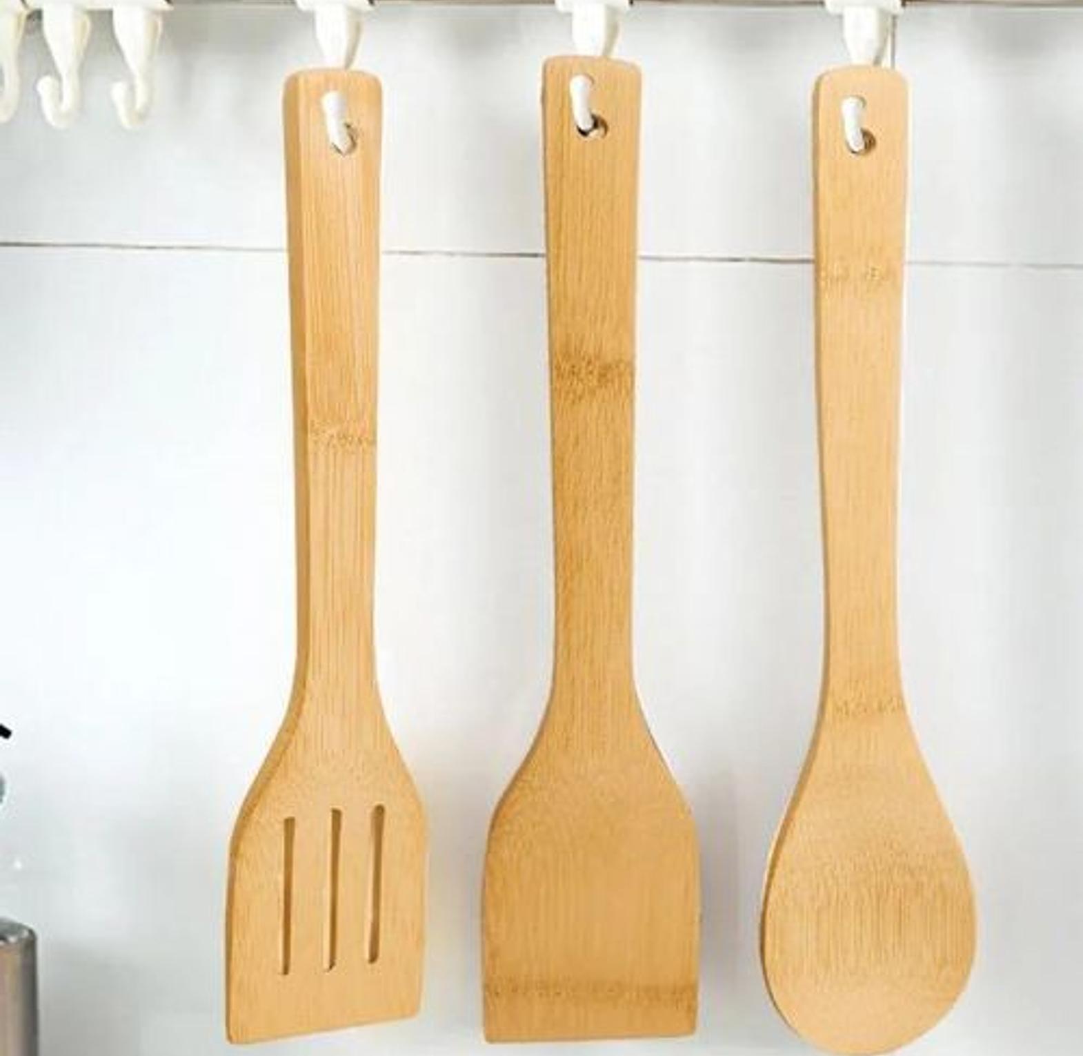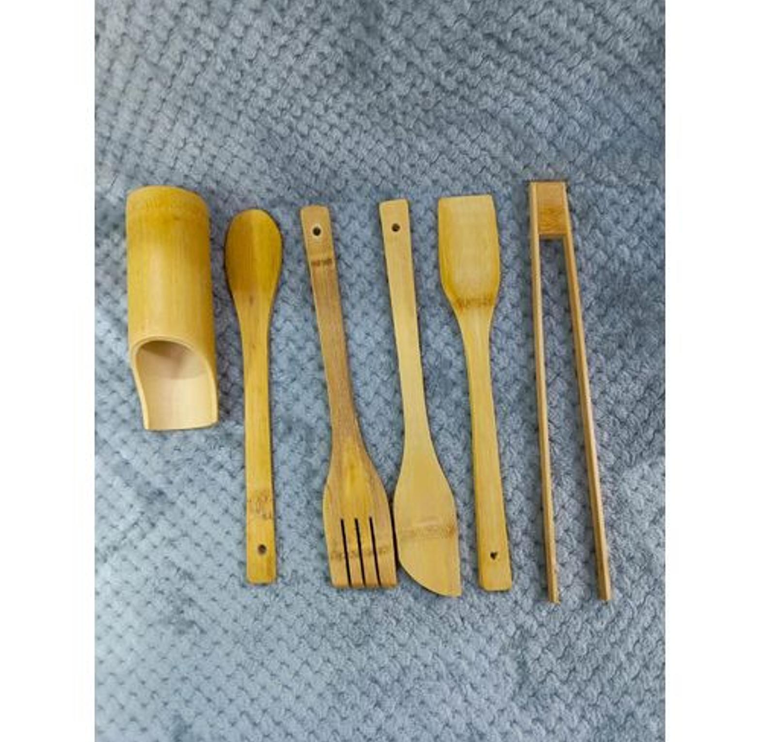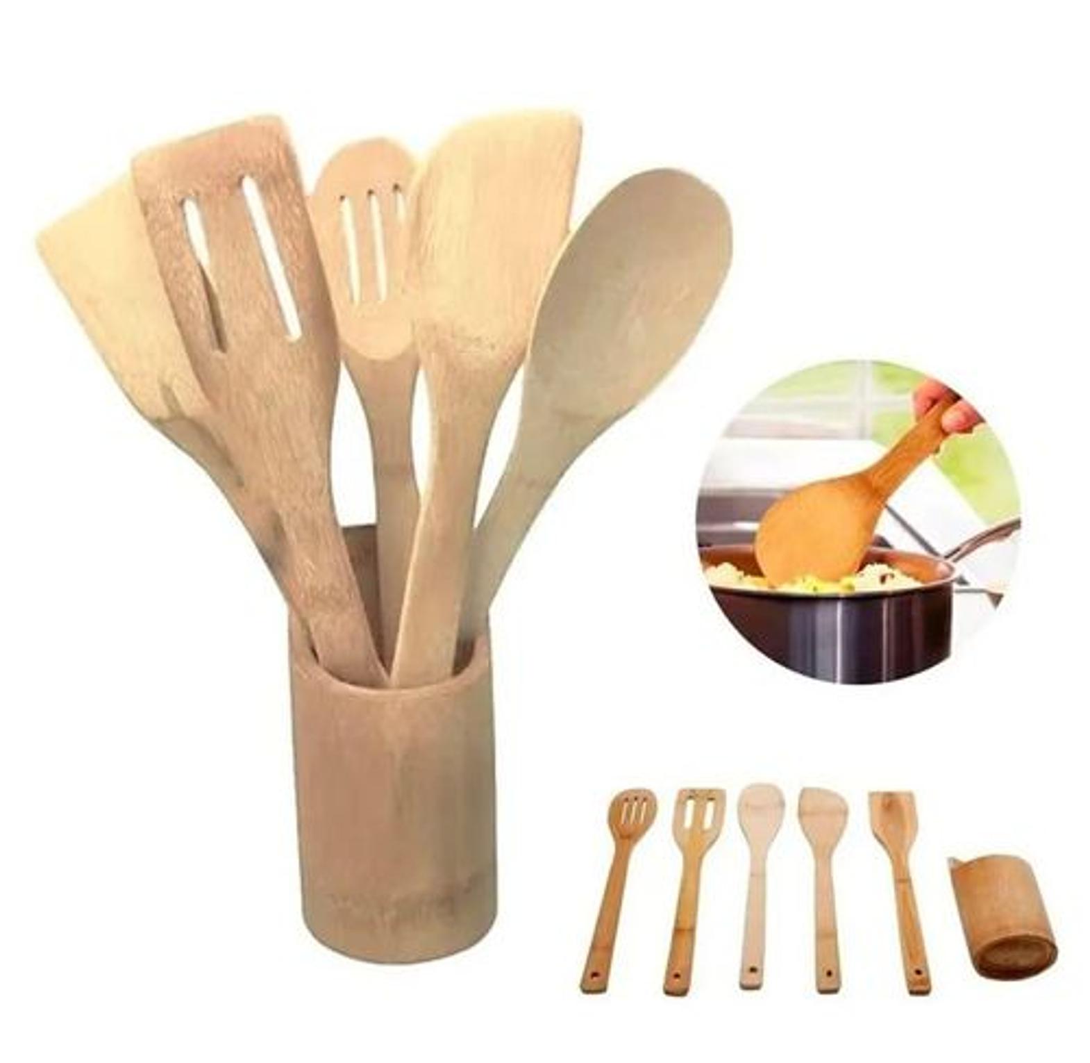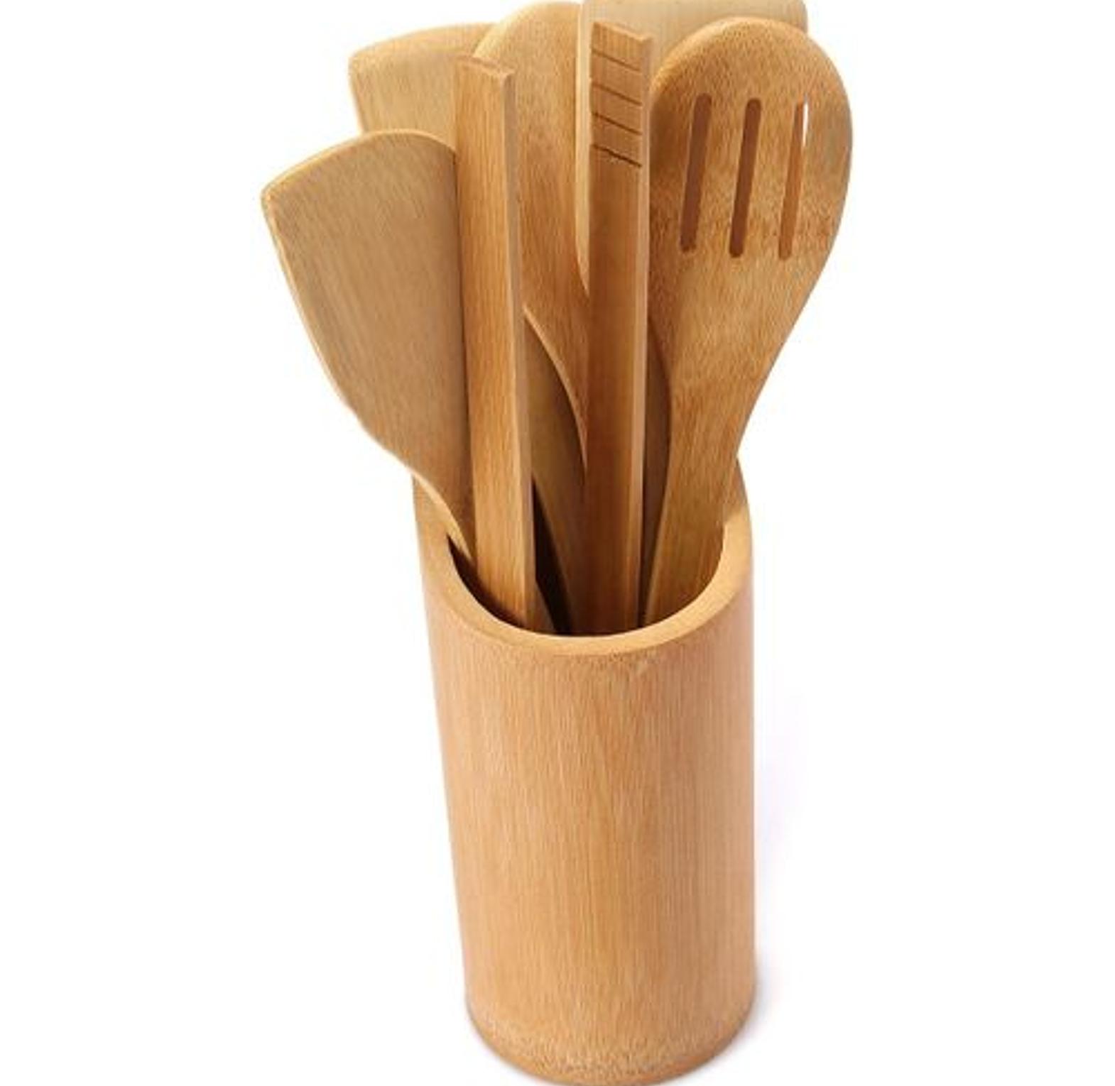 made of bamboo Set consists: 1 PC spaghetti server. 1 PC soup ladle. 1 PC slotted spoon . 1 PC spoon . 1 PC rice skimmer .1 PC slotted turner . 1 PC stand . Safe and easy to use Can easily be cleaned
