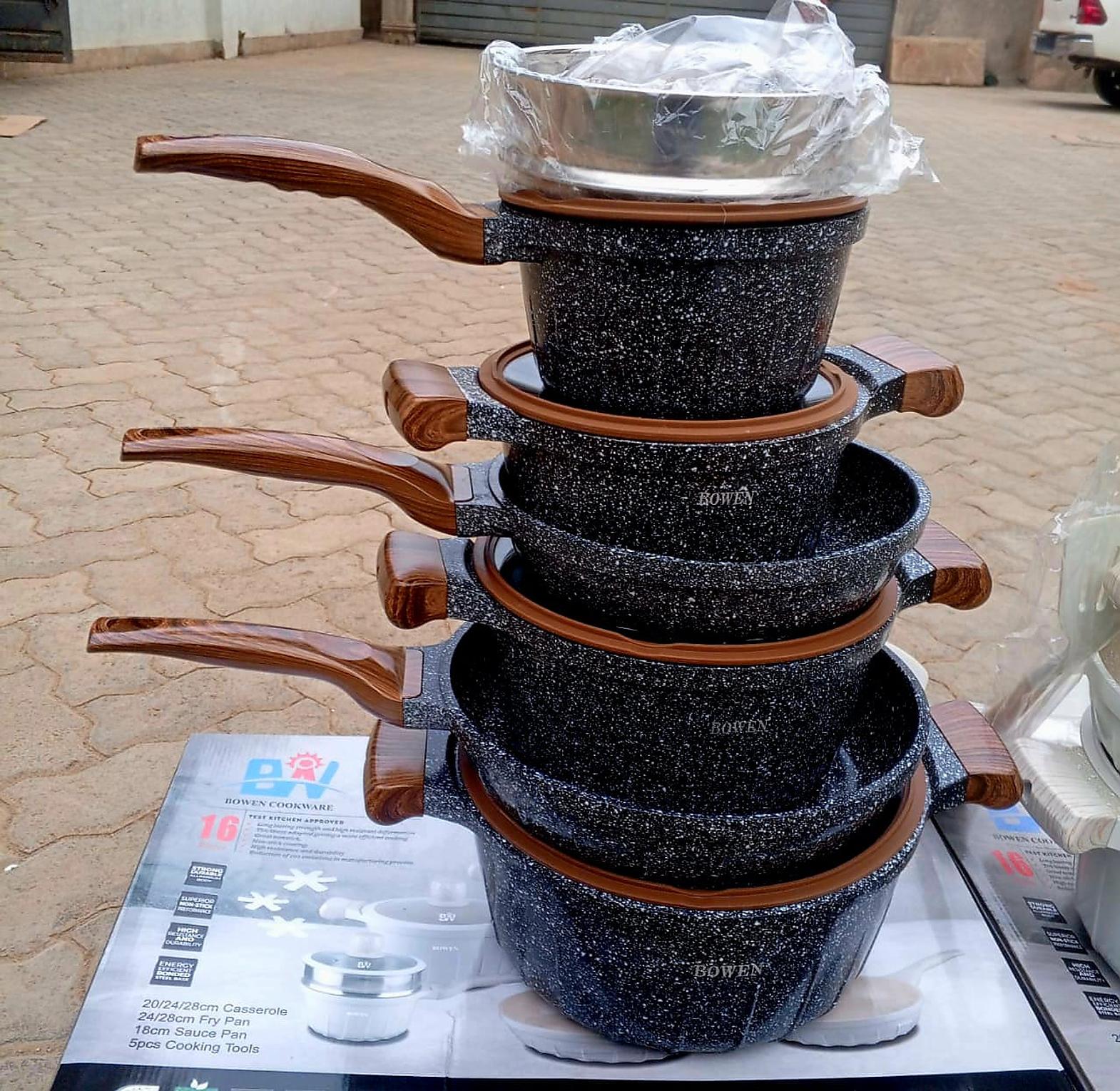 Material: Pressed aluminum with a ceramic-marbled non-stick coating, free of PFOA. Features: Lightweight with excellent heat conductivity, resistant to scratching and high temperatures, and equipped with soft-touch silicone handles. Lids: Made of tempered glass with a steam hole. Compatibility: Suitable for all types of cookers, including induction stovetops.