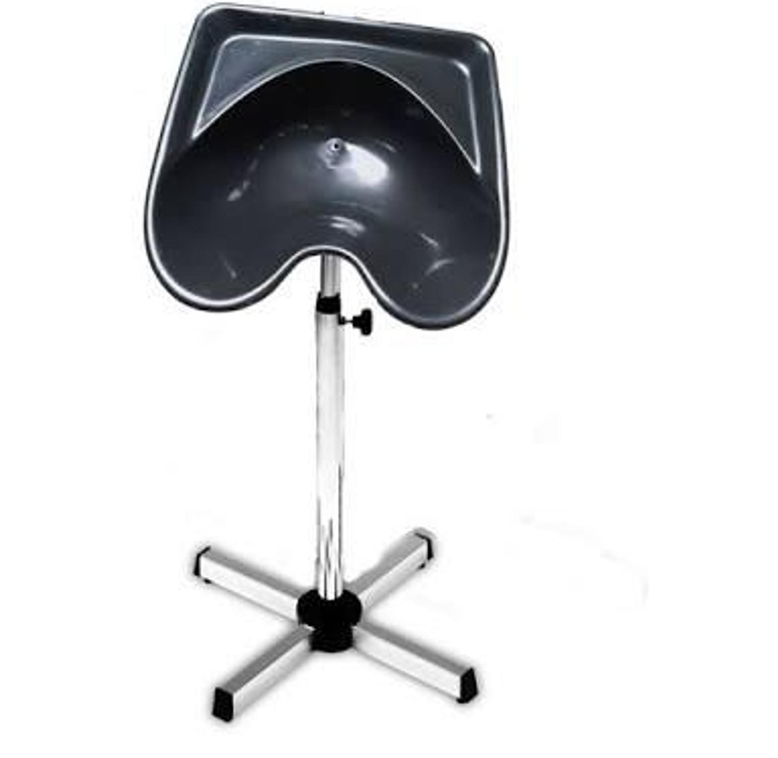 About the product Portable hair sink made of durable ABS composite Extra-large capacity: 20 in. x 19 in. x 9-1/2 in. deep Strong pedestal base with 1-1/2 in. diameter and 5 legs (22 in. diameter base) Height adjustable from 39 in. to 55 in. from floor to top of basin when parallel Portable basin is tilt-able to allow neck rest to dip to about 33 in. from floor This lightweight, portable shampoo basin is constructed of durable ABS composite with a rolled edge for both strength and client comfort. The bowl has a large capacity, and measures 20" front to back, 19" across and 9-1/2" deep. It connects to the base with a sturdy steel bracket. The pedestal has a 1-1/2" diameter, chrome metal riser with five legs that form a 22" diameter base. Composite feet/bumpers are included on the bottom of the stand to protect floors from marks. The sink can be permanently installed in a salon, or can be carried to a client's home for portable use (supply your own water source such as a water pitcher or hose, and basin may be drained into a bucket). A rubber plug stopper is included that fits the drain opening at the bottom of the basin, and a flexible, ribbed drain hose (60" long x 1-1/4" diameter) connects to the underside of the basin. Sink is adjustable to accommodate reclining or standard chairs. It tilts front or back and can be raised or lowered from 39" to 55" (measured from floor to top of basin when level). The neck rest dips to as low as 33" from the floor when titled, so this unit can be used with just about any chair. Includes basin with stand (minor assembly required), drain hose, drain hose clamp and instructions.