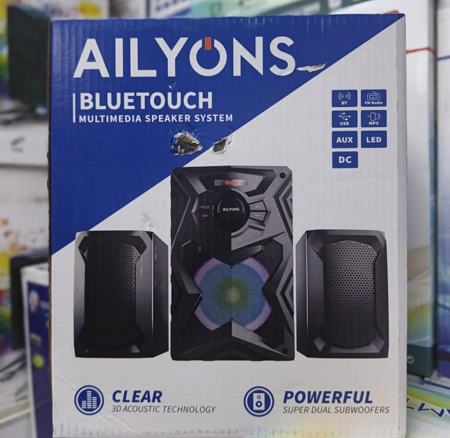 Ailyons Bluetouch Multimedia Speaker System. While the specific model number isn't visible in the image, it's a 2.1 channel system featuring Bluetooth connectivity and powerful subwoofers.