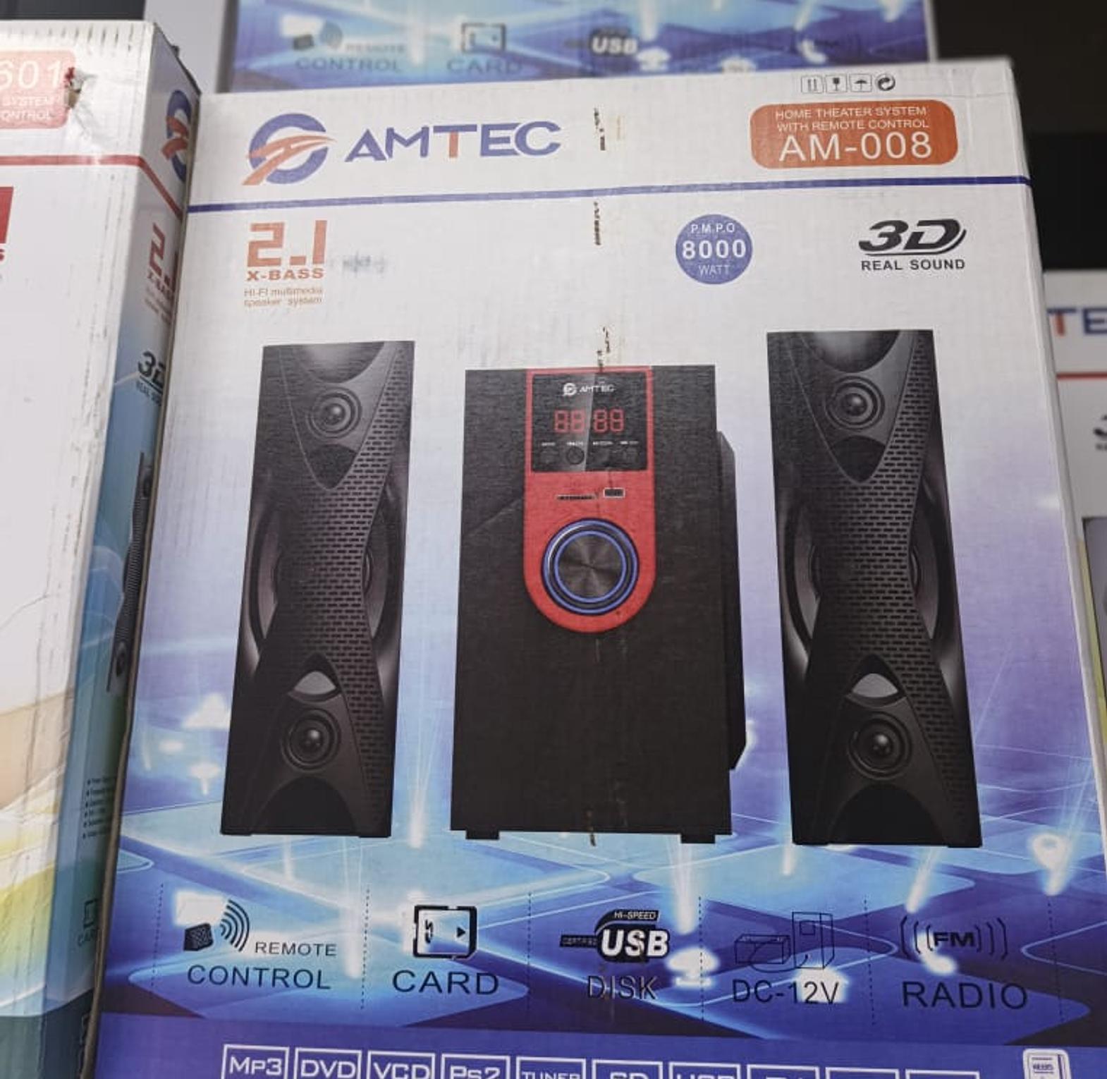 Model Name: Amtec AM-008. Channels: 2.1CH, indicating a subwoofer and two satellite speakers. Sound Output: 5000W PMPO (Peak Music Power Output). Note that the image also displays "PMPO 8000 WATT", which might be a different variant or a marketing discrepancy.