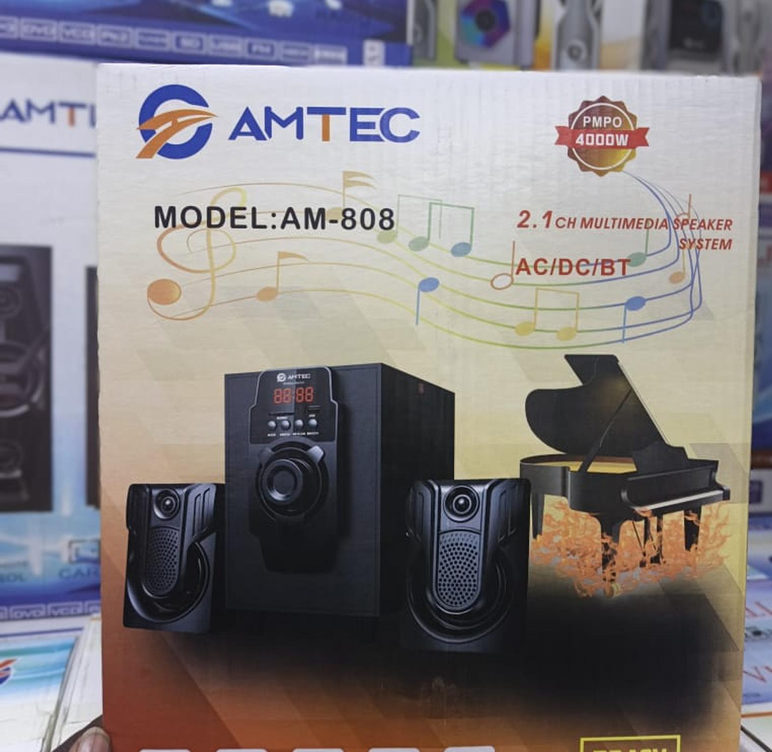 Name: Amtec AM-808 2.1CH 4000W Active Subwoofer Speaker System. Power Output: 4000W PMPO (Peak Music Power Output). Channel Configuration: 2.1 Channel Multimedia Speaker System. Connectivity: Features Bluetooth for wireless streaming, USB and SD card slots for playing music from storage devices, and FM radio for listening to stations. Features: Includes an LED display, support for AUX input, and comes with a remote control. Power Source: Operates on AC/DC, with support for 12V DC input. Design: A compact unit designed to provide good quality sound and match living room aesthetics.