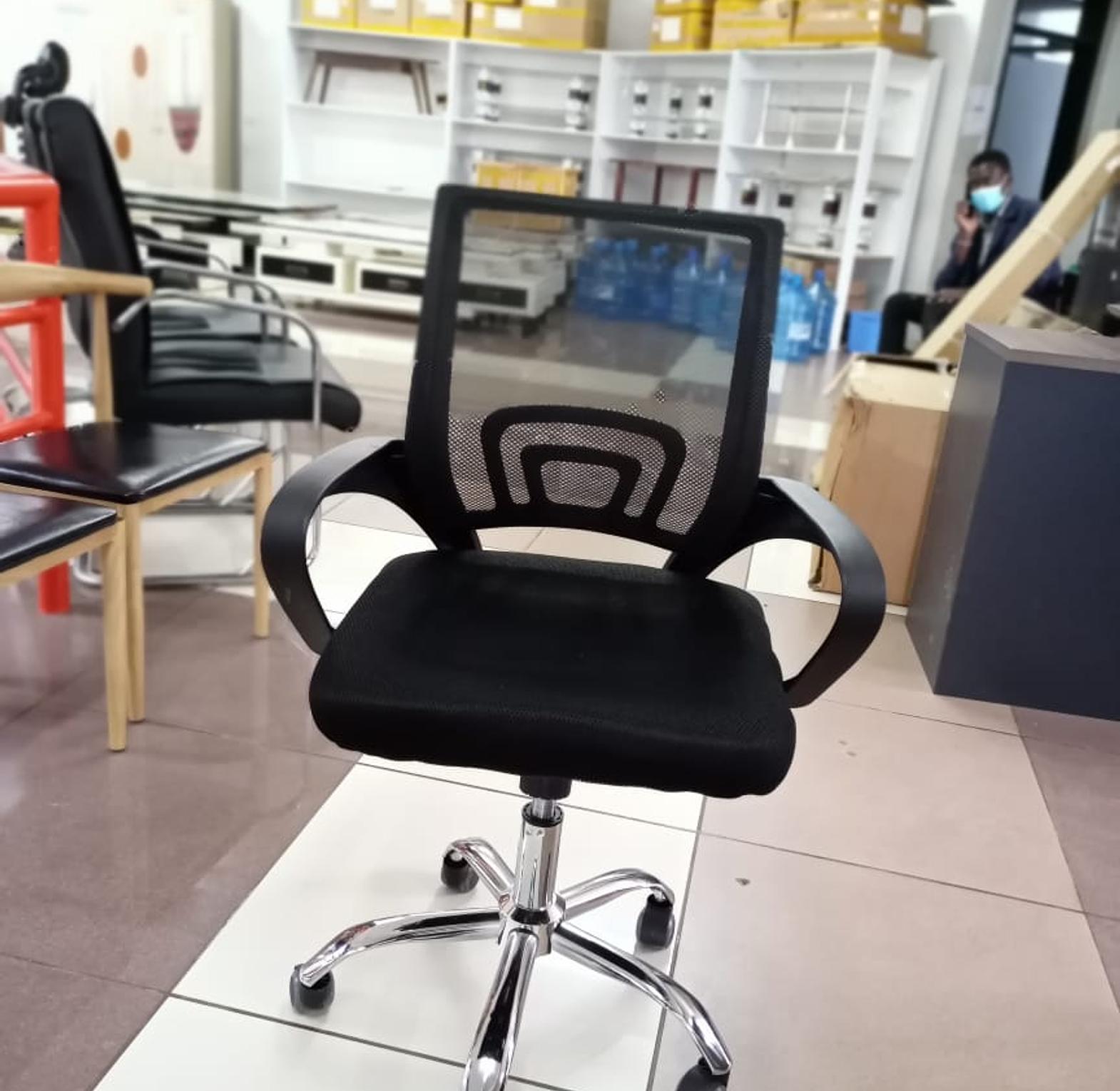 Design: Features a mesh backrest for breathability and a padded seat for comfort, often with a sleek design to fit various office interiors. Mobility: Equipped with wheels on a cruciform base for easy movement within a workspace.