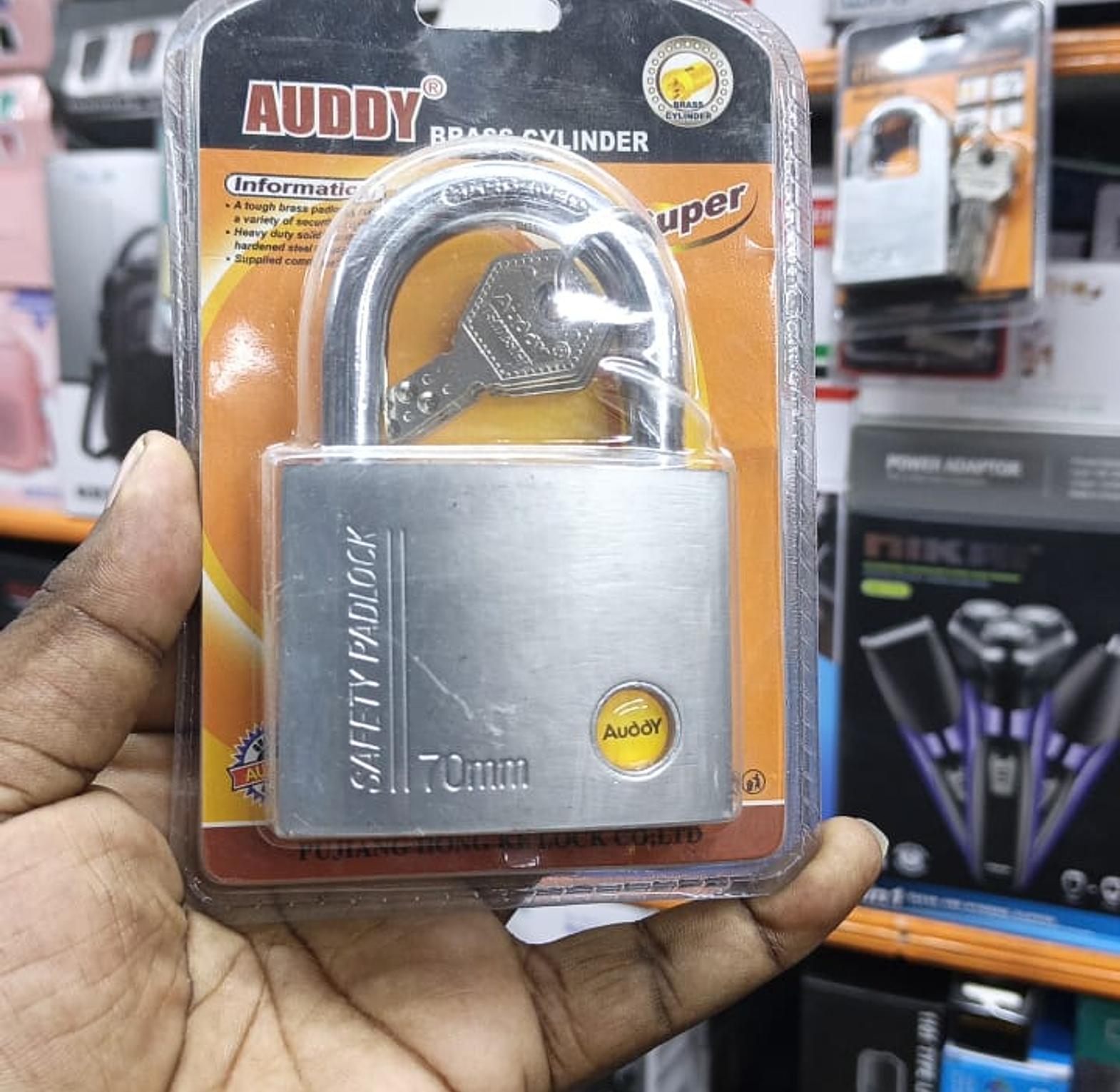 Name: Auddy Brass Cylinder Safety Padlock (70mm). Material: Solid brass body with hardened steel shackles. Security Features: Designed for enhanced security, resisting tampering and physical attacks. High-precision design makes it difficult to copy keys, offering a burglar-proof advantage.