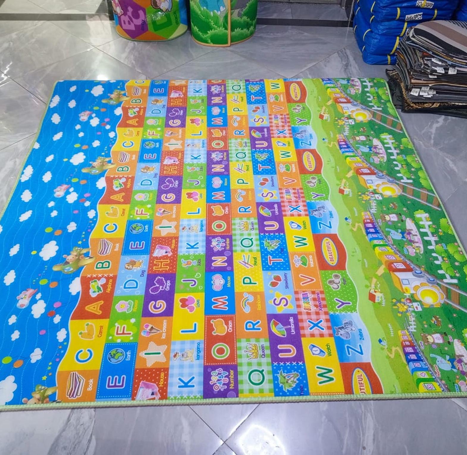 This play mat is designed to provide a safe and stimulating environment for babies and young children for activities like crawling, tummy time, and playing. It typically features: Educational Content: Incorporates elements like alphabets, numbers, and various illustrations to aid in early learning and recognition. Safety Features: Often made from soft, non-toxic, and eco-friendly materials like EPE foam, and designed with good elasticity and a soft surface to protect the baby. Practicality: Many versions are waterproof, easy to clean, durable, and may feature non-slip backing for added safety. Specifications (based on common sizes and features): Size: Commonly found in large sizes such as 1.6 x 1.95 meters (approximately 5.2 x 6.4 feet) or 1.5 x 2 meters (approximately 5 x 6.6 feet), providing ample space for movement. Other sizes like 180x120cm and 90x120cm are also available, as indicated in the image's detected text. Material: Often constructed from high-quality, eco-friendly materials like EPE foam or nylon. Features: May include non-slip backing, machine washability, and foldable designs for easy storage. Theme: The specific theme can vary, but educational elements like alphabets, numbers, and city life or animal illustrations are common.