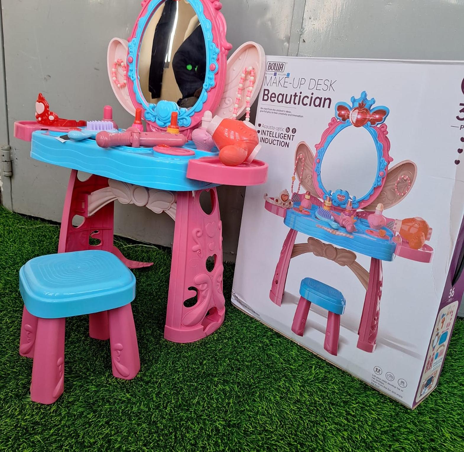 Pretend play vanity set designed for young children, often featuring a mirror, a stool, and various pretend makeup and styling accessories.