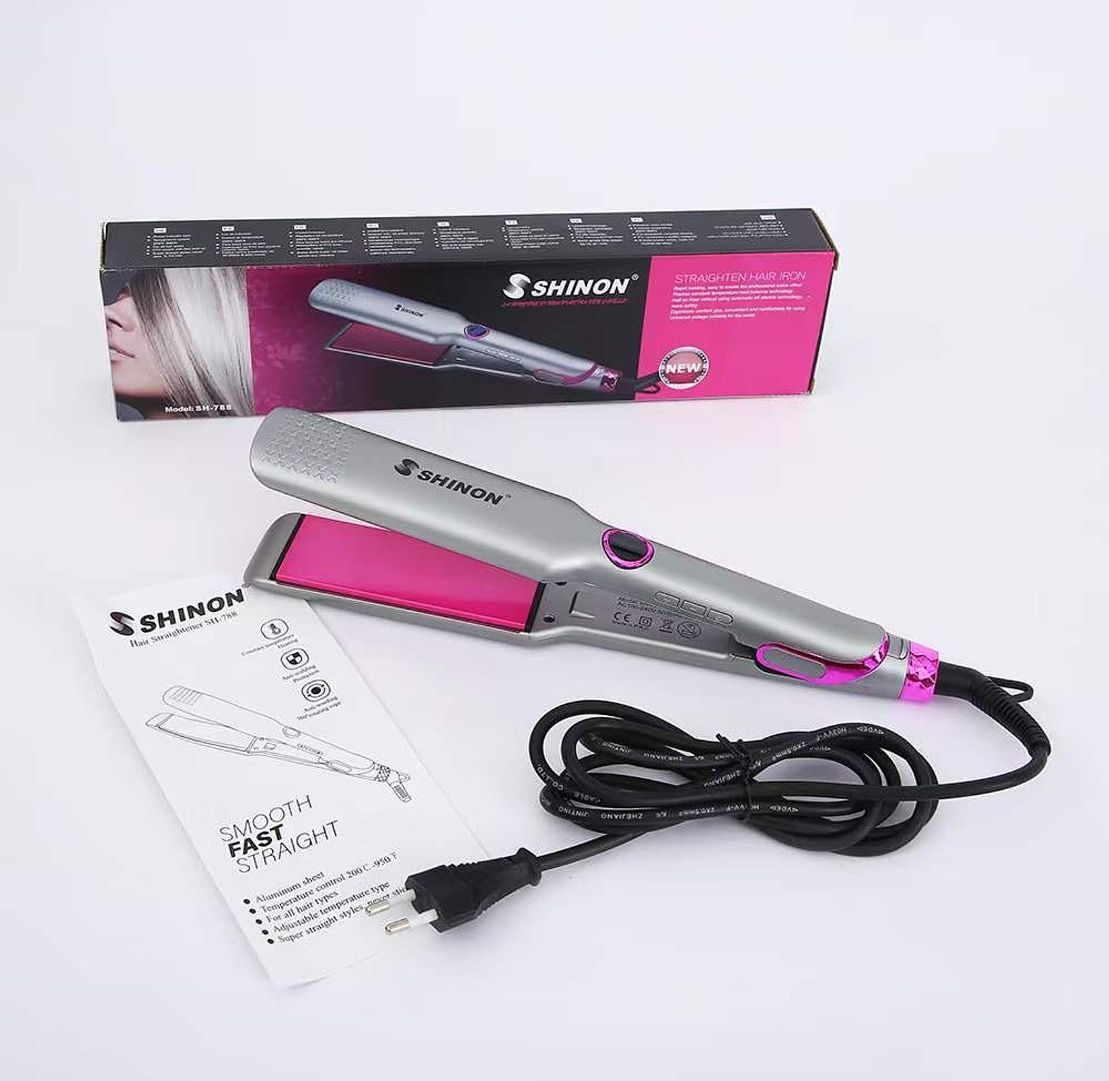 The item in the image is a Shinon SH-788 Hair Straightener, which is a hair styling tool designed for straightening hair. It features an adjustable temperature control ranging from 200°C to 950°C, suitable for all hair types. The straightener also has a ceramic coating and a 360-degree swivel cord. It is designed for smooth, fast, and straight styling.