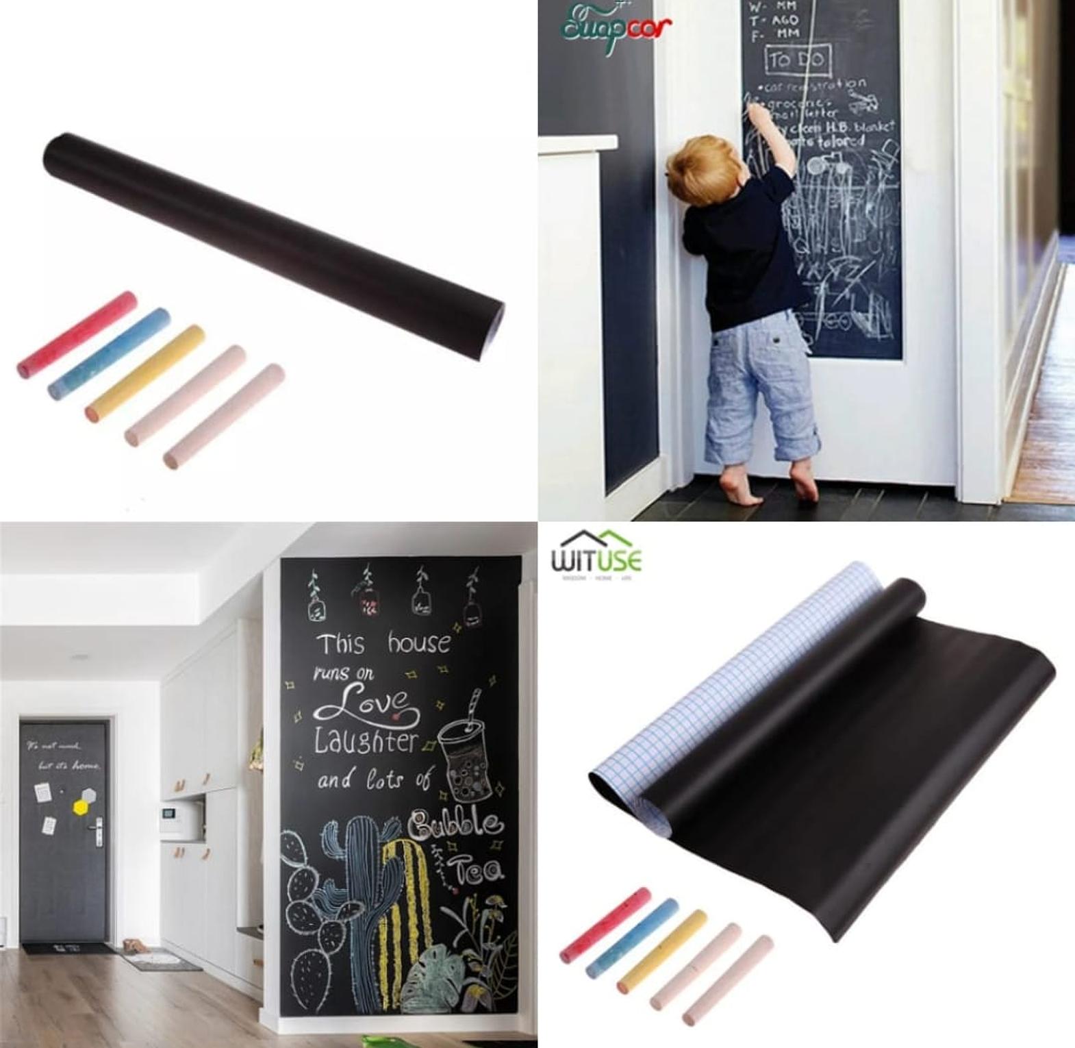 Chalkboard paper one roll contains 45 x 200cm of a strong vinyl material Frosted surface that can be used for chalk writing Gives you plenty of room for writing menus, sweet messages, to-do lists Interesting Diy Can be used as a kids room décor, child blackboard, tutoring supplies, kid wall art or home school materials! Even can be spice up your kitchen counter, furniture, notebook, dresser drawer, crafts, bedside table, bookcase, bookcase, door even wall. Suitable for smooth and flat surface. Can Be Used As a Kids Room Decor, Child Blackboard, Tutoring Supplies, Kid Wall Art or Home School Materials FREE CHALK: 5 FREE regular chalk sticks with your purchase so you can start your writing or drawing as soon as you receive your chalkboard sticks EASY TO USE: Remove the backing paper, then stick the black board decal on your surface. The high quality adhesive makes the chalk paper removable and repositionable without damaging the surface.(For Best Bonding, Hang It Like A Long Towel In The Air For 72+ Hours. Please Make Sure Paper Is Flat)