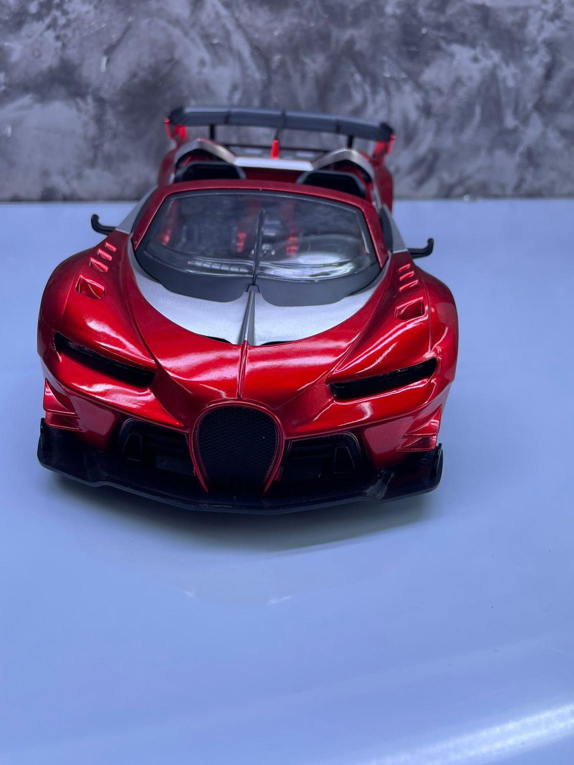 Brand: Bugatti Model Car. Resemblance to the luxury car brand. Type: It's a 1:14 scale model, operated via remote control. Features: It has functional doors, detailed interior, and often includes working lights. Power: battery-operated, rechargeable, with a remote controller. Material: Typically made of ABS plastic with a glossy paint finish. Control: Moves forward, backward, left, and right, controlled by a 2.4 GHz remote. Durability: Designed to withstand collisions, suitable for indoor and outdoor