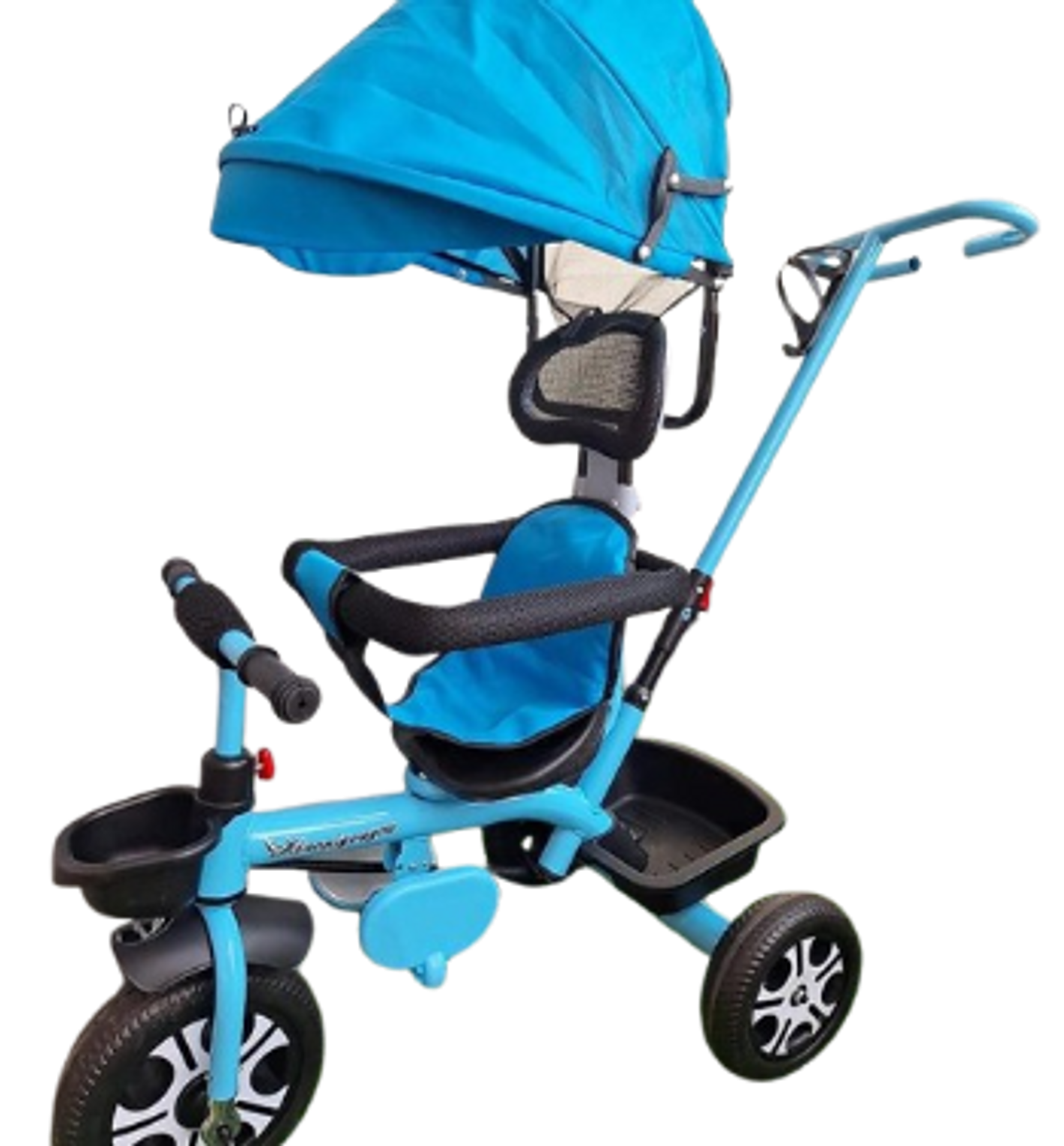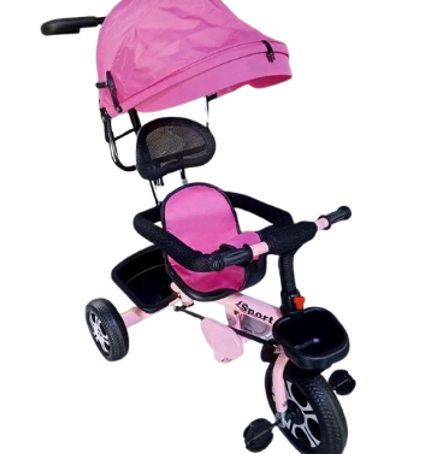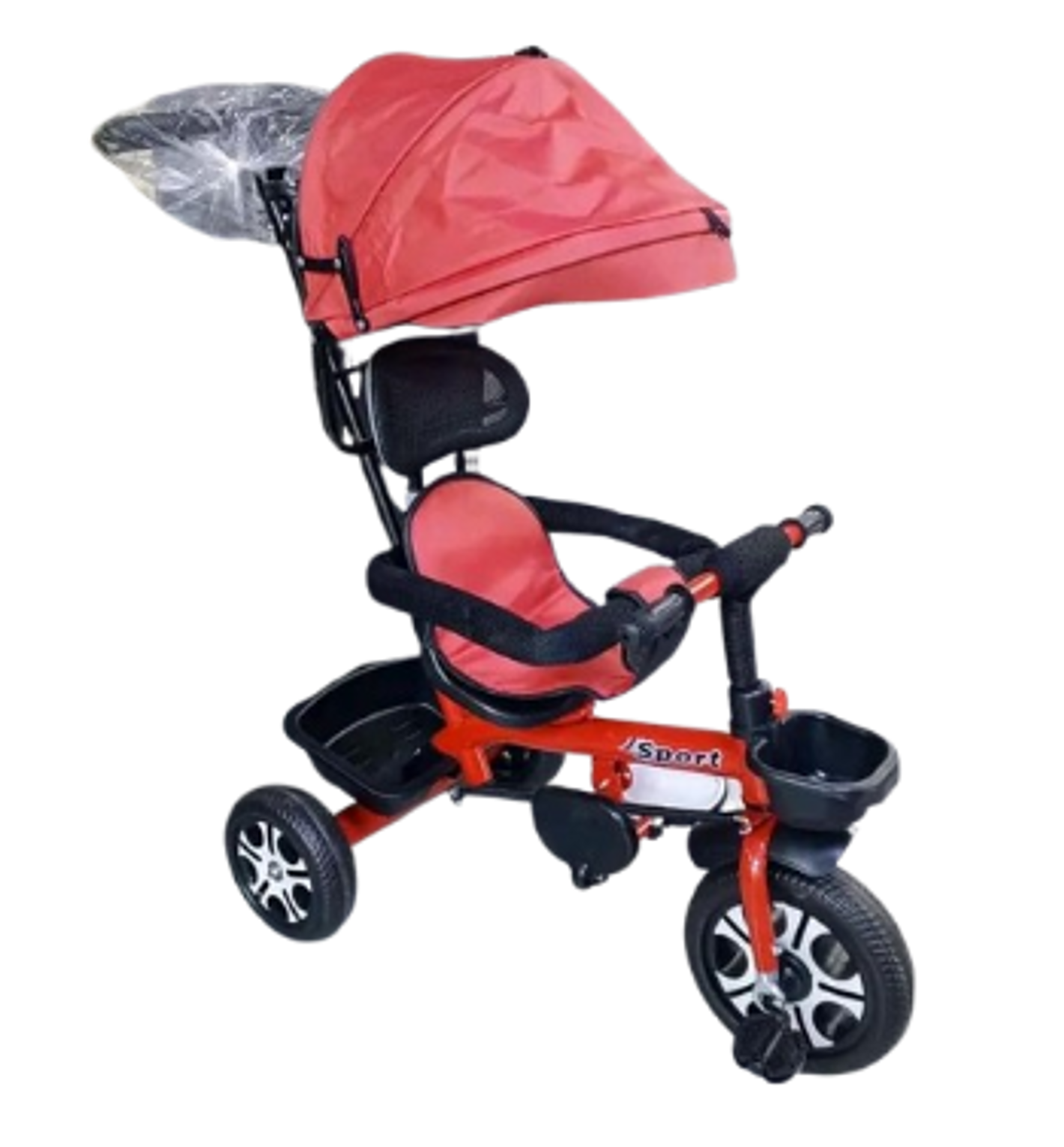 This versatile vehicle functions as both a parent-controlled stroller and an independent tricycle. It features a modular design where components like the UV-protective canopy, safety guardrail, and parental push handle can be removed as the child grows more confident in riding. The "Sport" model is characterized by its bold red high-carbon steel frame, a 360-degree rotatable seat for face-to-face interaction, and shock-absorbing wheels suitable for various terrains like asphalt or wood floors