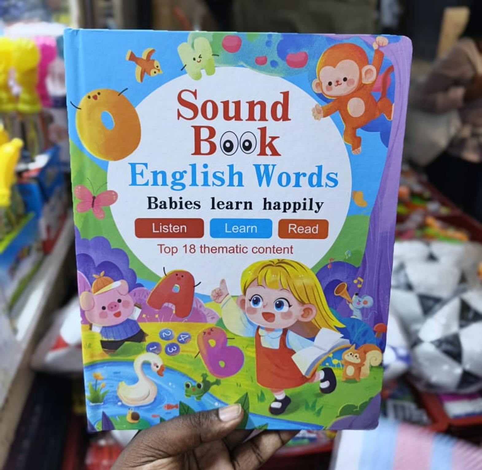 This is an interactive learning book designed for babies to learn English words happily. It features "Top 18 thematic content" and encourages learning through listening, learning, and reading.