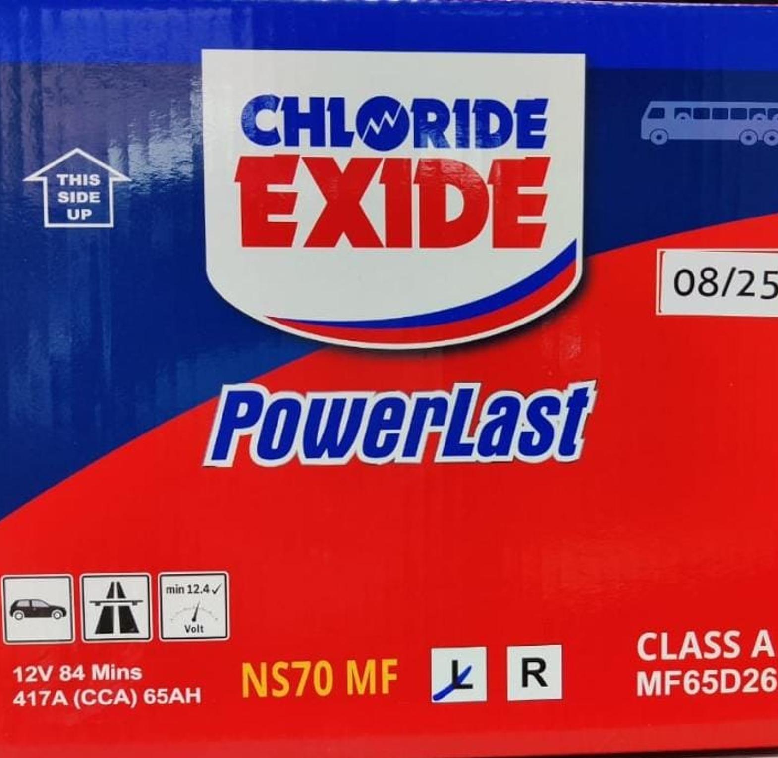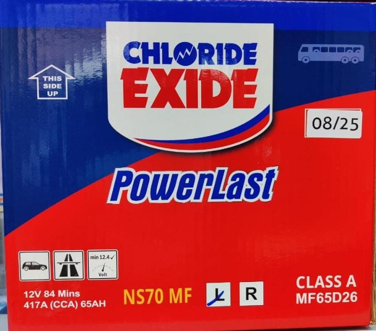The Chloride Exide PowerLast NS70 MF is a maintenance-free automotive battery designed for reliable starting power and extended service life. It is suitable for larger vehicles and those with standard ignition systems, providing consistent power support for various vehicle applications.