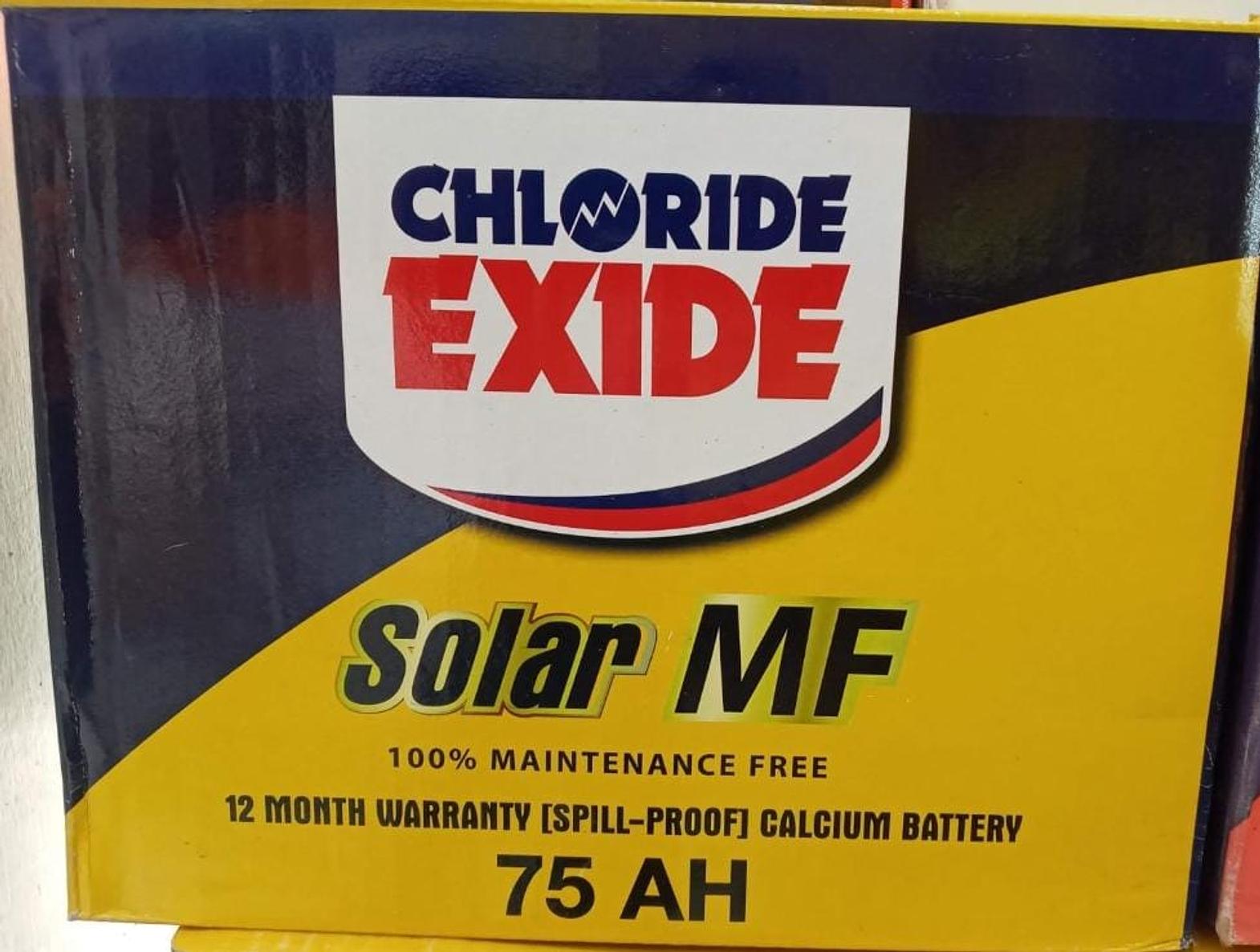 Name: Chloride Exide Solar MF Battery. Capacity: 75 AH (Ampere-hours). Type: 100% Maintenance-Free (MF). Technology: Calcium Battery. Warranty: 12 Month Warranty. Feature: Spill-Proof. Application: Designed for solar energy storage applications, including off-grid solar systems and backup power solutions. Performance: Known for reliable performance and long life.