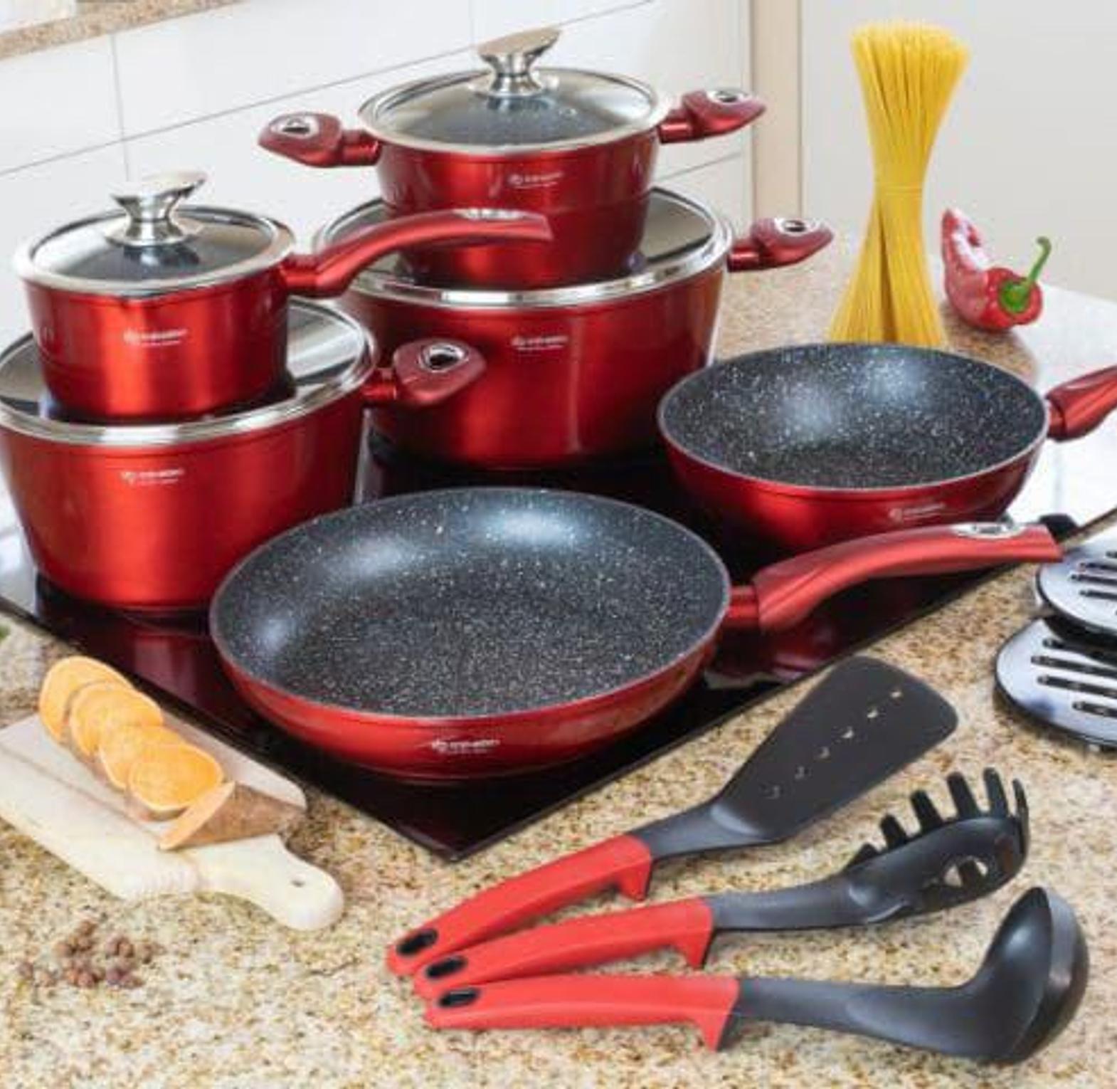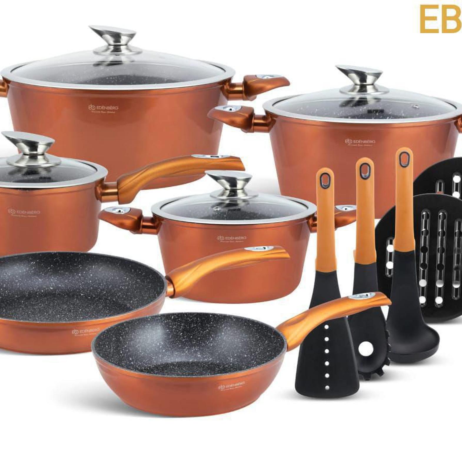 he pots are made of high quality pressed aluminum with a ceramic marble coating which is additionally coated with a non-stick layer. Thanks to this design, these pots can be boiled, steamed and fried with a minimum of fat, and washing is extremely easy. The aluminum construction is lightweight and distributes heat very well. The outer ceramic marble coating is resistant to high temperatures and abrasion Pots are suitable for use in gas, electric, halogen, ceramic and induction cookers. Ergonomic and strong handles do not heat up. They are designed to be used comfortably and without gloves to hold even a heavy pot filled to the brim in your hands. Edenberg logo engraved on the bottom of the pot, a sign of the product meets the highest quality standards. For the production of kitchen items, we only use the best quality materials.
