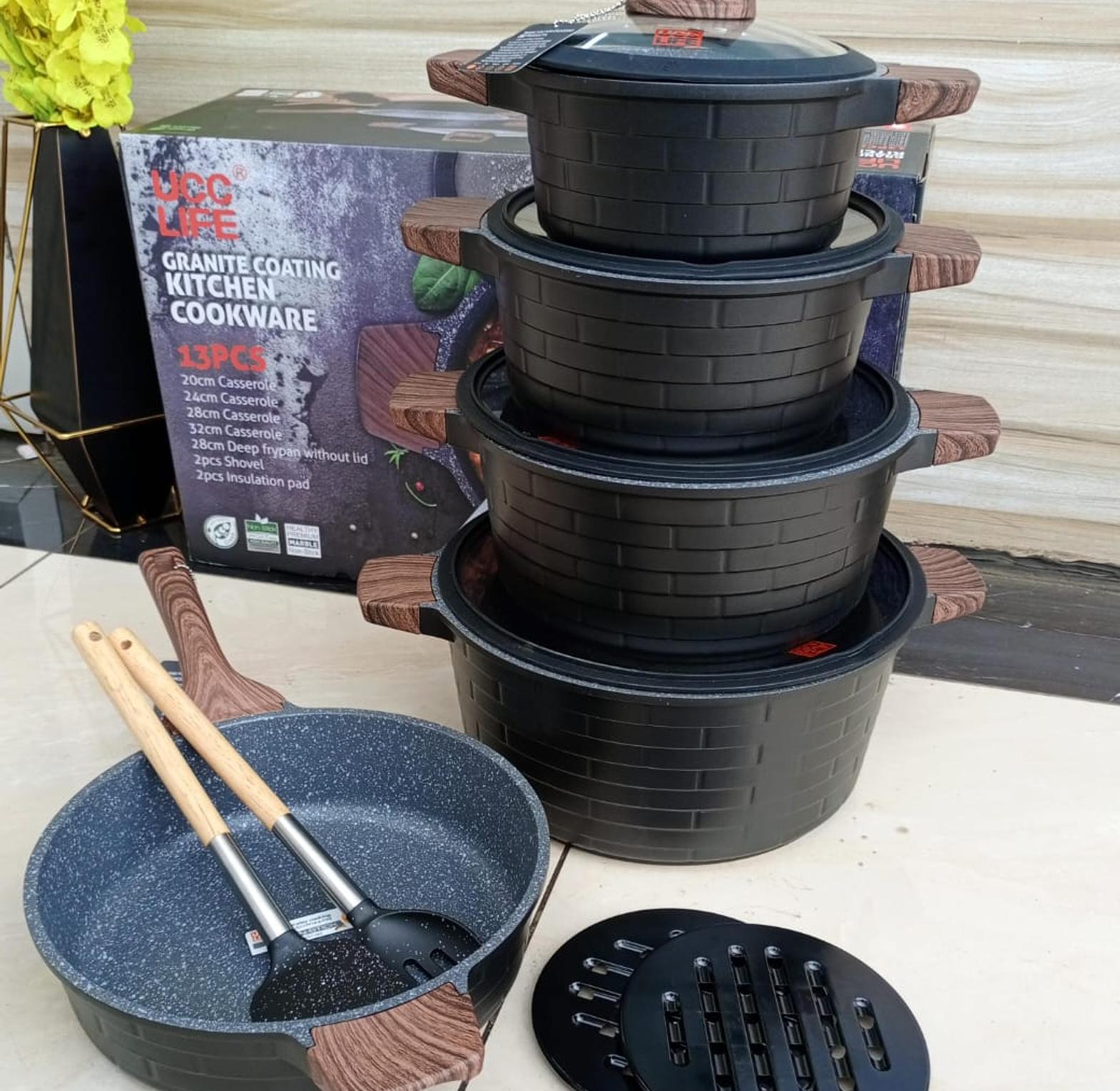 This is a UCC LIFE 13PCS GRANITE COATING KITCHEN COOKWARE SET . Durable aluminum cooking pots provides long lasting superior Non-stick performance and has different sizes for different cooking needs hence you can cook different delicacies. It is light and easy to maintain with protective layer added to make it less reactive and more scratch resistant. It also has glass lids makes viewing food easy from start to finish. It is both a healthy and an Eco friendly way to cook, suitable for home and can be used for long time. Furthermore it spreads heat evenly and is energy efficient, and makes it easier to regulate heat so the food does not burn and stick.