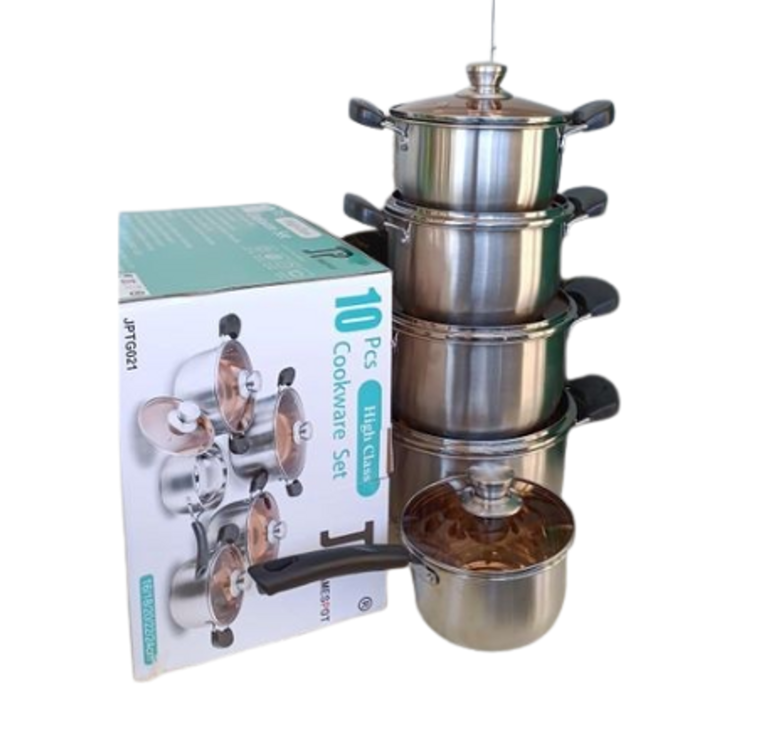 Jamespot Cookware Set - a 10-piece ensemble designed to elevate your culinary experience to new heights. Crafted with precision and quality in mind, this cookware set combines functionality, durability, and aesthetic appeal to meet the demands of both aspiring home chefs and seasoned professionals. Key Features: Premium Materials: Each piece is meticulously crafted from high-quality stainless steel, ensuring longevity and resistance to rust and corrosion. The sturdy construction guarantees even heat distribution for consistent cooking results. Versatile Selection: This 10-piece set includes a variety of essential cookware, such as saucepans, frying pans, and stockpots, providing versatility for a wide range of cooking techniques. From sautéing and simmering to frying and boiling, you'll have the perfect tool for every culinary task. Non-Stick Coating: The cooking surfaces feature a non-stick coating, promoting healthier cooking with less oil and easy food release. Cleaning up is a breeze, making your kitchen routine more efficient. Ergonomic Design: The ergonomic handles stay cool on the stovetop, ensuring a comfortable grip while cooking. The lids are designed with heat-resistant knobs for safe and convenient use. Glass Lids: Transparent, tempered glass lids allow you to monitor your cooking without lifting them, preserving heat and flavors. The tight-fitting lids lock in moisture and nutrients for delicious and perfectly cooked meals. Easy Maintenance: Dishwasher safe for hassle-free cleaning, this cookware set is designed to make your post-cooking cleanup a simple task. Spend more time enjoying your meals and less time scrubbing pots and pans. Contemporary Design: The sleek and modern design of the Jamespot Cookware Set adds a touch of elegance to your kitchen. The polished stainless steel exterior complements any kitchen decor, making it a stylish addition to your culinary space.