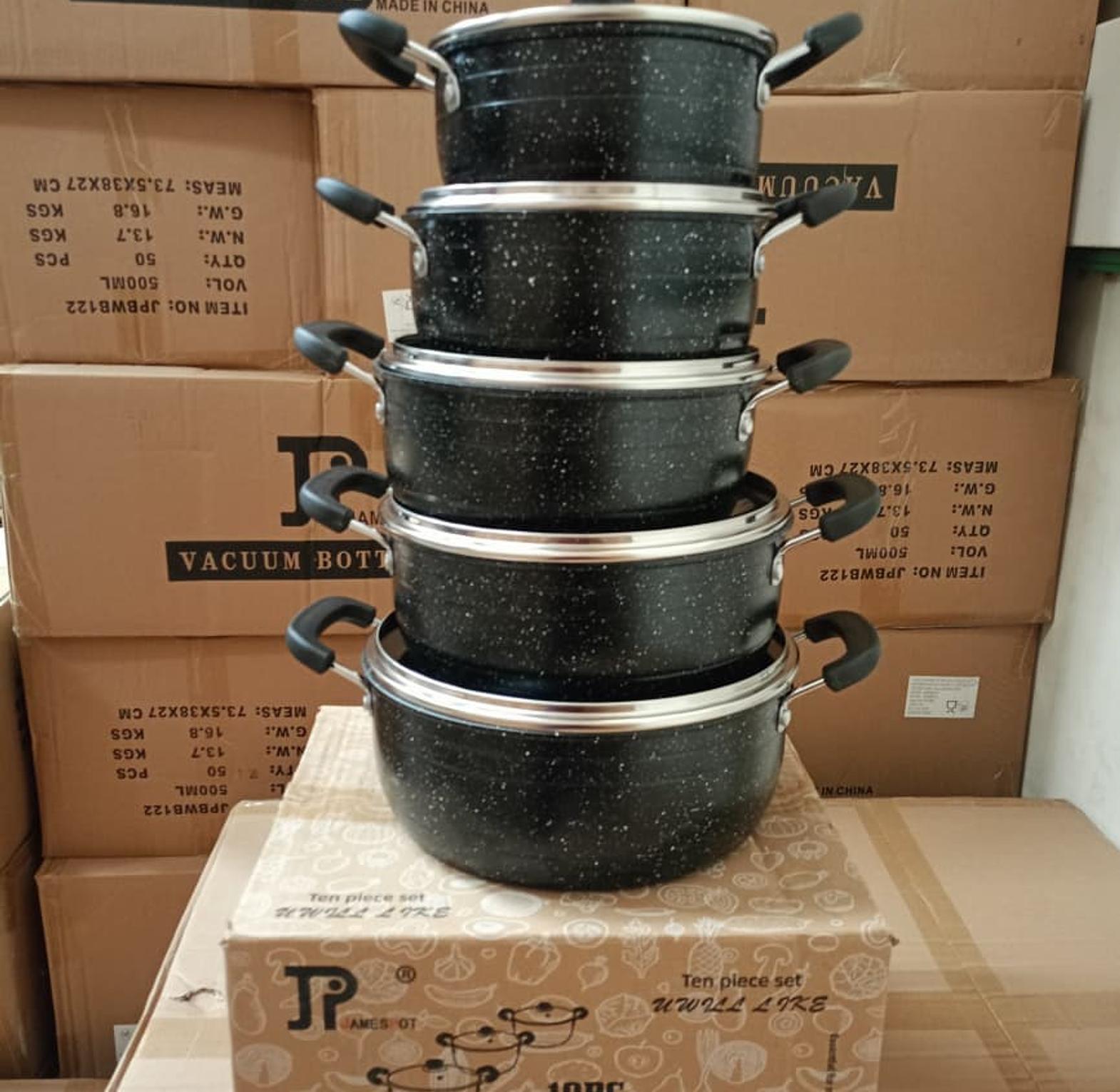 Upgrade your kitchen with the JP Jamesport 10-Piece Granite Non-Stick Cookware Set, designed for both style and performance. Crafted from heavy-duty aluminum with a premium granite non-stick coating, this cookware set ensures even heat distribution, easy cleaning, and long-lasting durability. The black granite design with white speckles adds a modern touch to your kitchen.