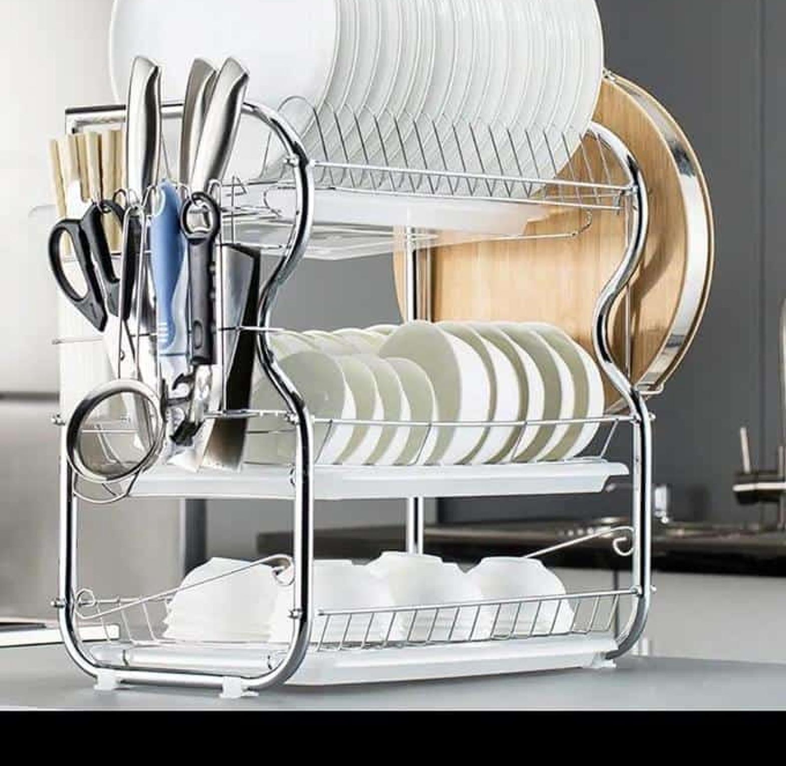 Made with high-quality steel, a 3 Layer Dish Drainer helps you organize your dishes or cutlery effortlessly. Its deep groves support large plates while the side-mounted cutlery holder along with the bottom tray gives you ease of storing. This stylish dish rack with a non-slip base gives the ultimate perfection to your modern kitchen. This easy to install Stainless Steel 2 Layer Dish Drainer Rack is a great way to drain water from washed dishes with ease to keep your sink clean and tidy.