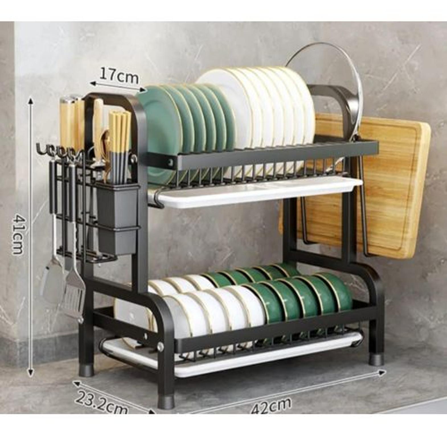 Glam your kitchen with this quality and unique 2 tier carbon stainless steel dish rack from us. Looking for a stylish 2 tier dish drainer with functionality? Looking for a durable dish drainer? Looking for a dish drainer with drain tray and cutlery cup? Looking for a dish drainer can hang goblet? This tier dish drainer is your BEST choice. Order online on Jumia for fast delivery countrywide. · Modern 2 tier design · Drainboard with drainage spot · Detachable cutlery cup included · Durable chrome-plated steel construction · Beautiful color matches most kitchen decoration · Box package. Step 1,2,3 easy no tool hook assembly