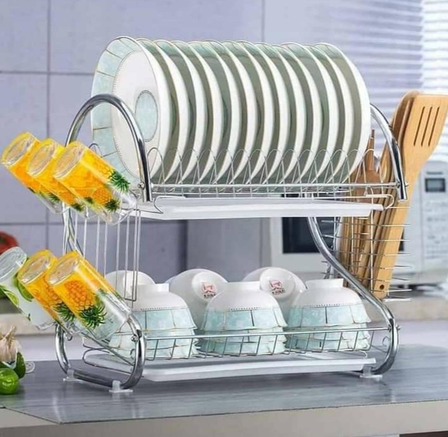 Product details Looking for a stylish 2 tier dish drainer with functionality? Looking for a durable dish drainer? Looking for a dish drainer with drainboard and cutlery cup? Looking for a dish drainer can hang goblet? This 2 tier dish drainer is your BEST choice. · ELEGANT DESIGN! that will make your kitchen look cool and organized · HIGH QUALITY! Chrome that will never Tarnish, Rust or Corrode · 100% SATISFACTION GUARANTEED: If you won’t love our product Rust-Proof and Easy to Clean The dish rack's fingerprint-proof finish keeps the rust-proof Stainless Steel body shiny. The utensil holder and dish drainer are both dishwasher-safe. You can wash other parts in warm, soapy water. Modern design Our professionals design tools that help people become more efficient at home And organized, your kitchen deserves as much as your bedroom, say goodbye to wet kitchen with this Dish rack.