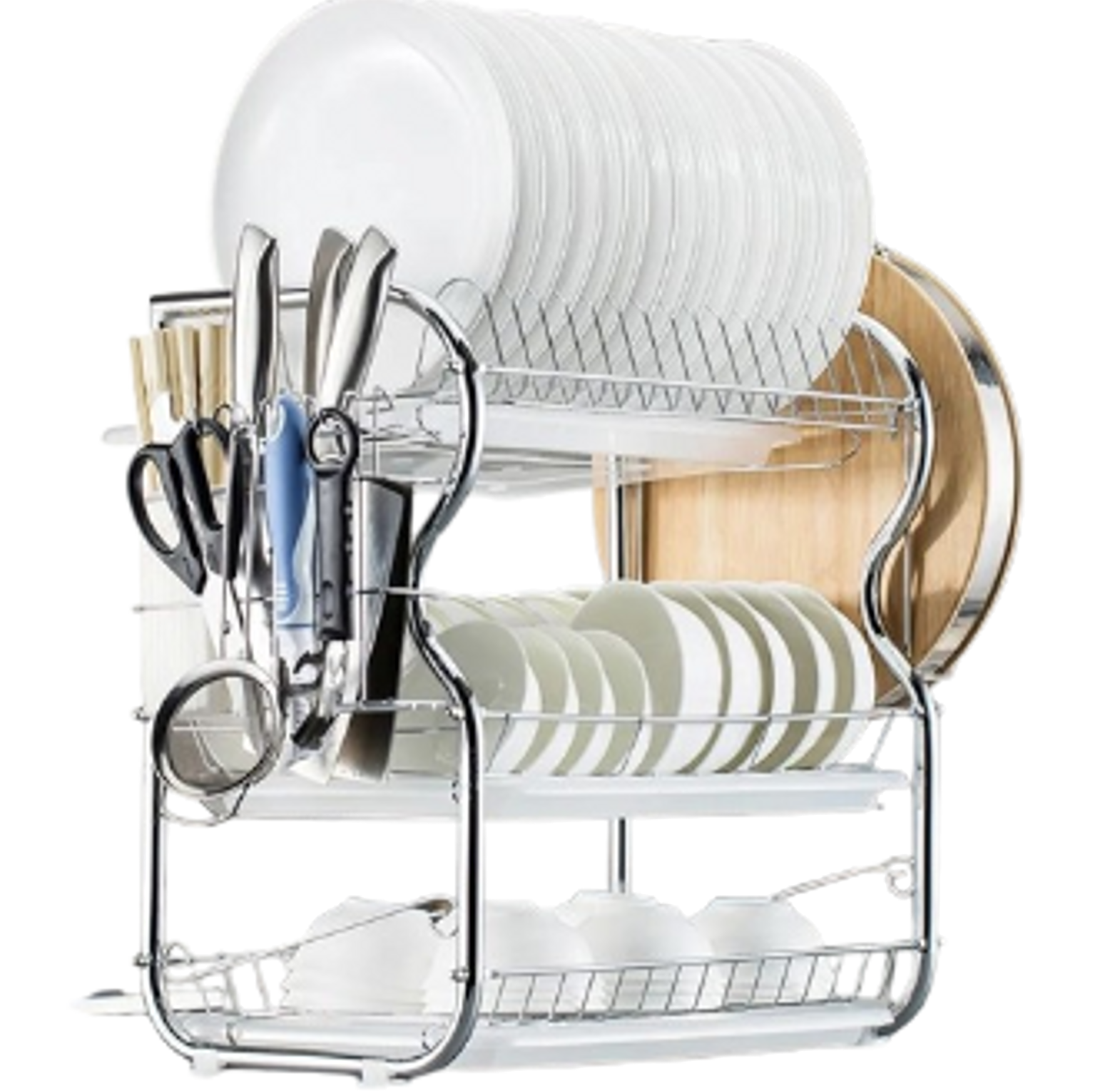 This 3 Tier Stainless Steel Dish Rack is the best option for household kitchen. It accommodates dishes and removable glassware rack and tray for drainage system. It is designed with durability and functionality at the same time fitting the style of every kitchen. Large, practical desiccator for plates, glasses and utensils. There are three drying levels and removable plastic trays that collect excess water. The cups and utensils are separate and can be removed. Allows ideal organization of the dishes and utensils. Necessary and useful accessory for each household. The chrome plated steel construction makes it stable and low-maintenance. It is designed with flexibility- enough to handle large household items and even party dishes.