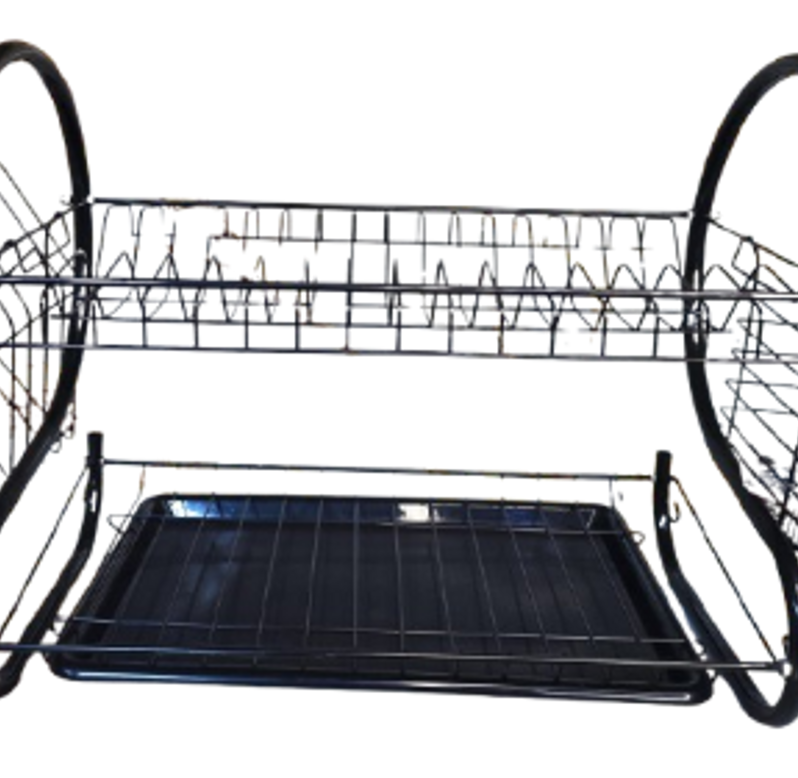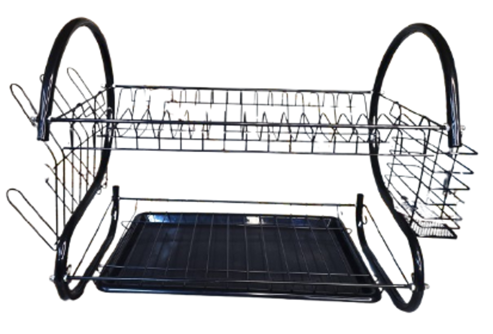 Design: A compact, two-level countertop dish rack designed to maximize kitchen space. Components: Includes a main upper tier for plates, a lower tier for bowls or mugs, a removable plastic drip tray to collect excess water, and side attachments for cutlery and possibly cutting boards. Functionality: Provides an organized solution for air-drying various kitchenware after hand washing.