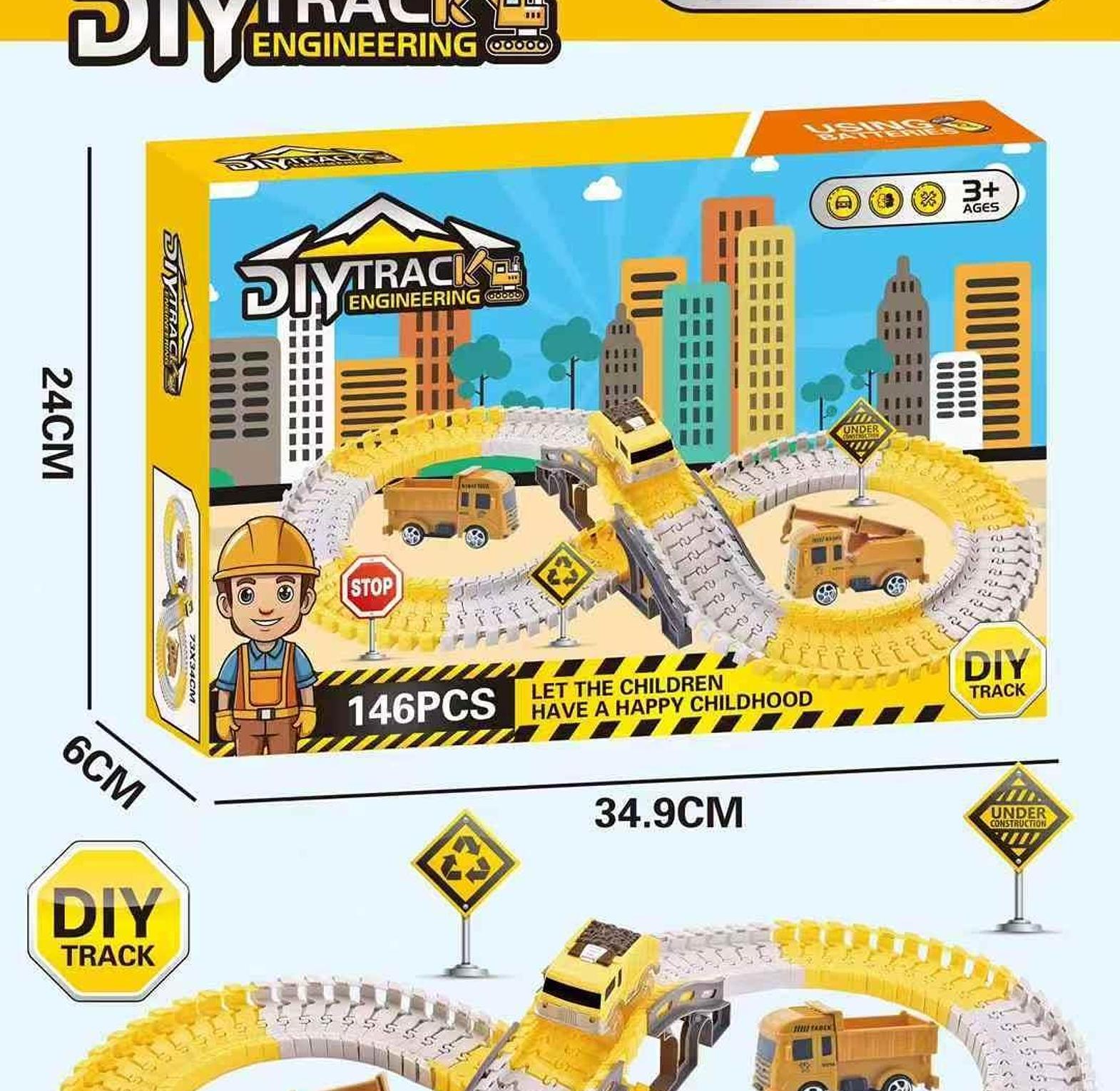 This playset features a customizable track system designed for construction vehicles like diggers and dump trucks, allowing children to build their own construction sites and engage in imaginative play. The flexible tracks enable various configurations, promoting creativity and problem-solving skills.