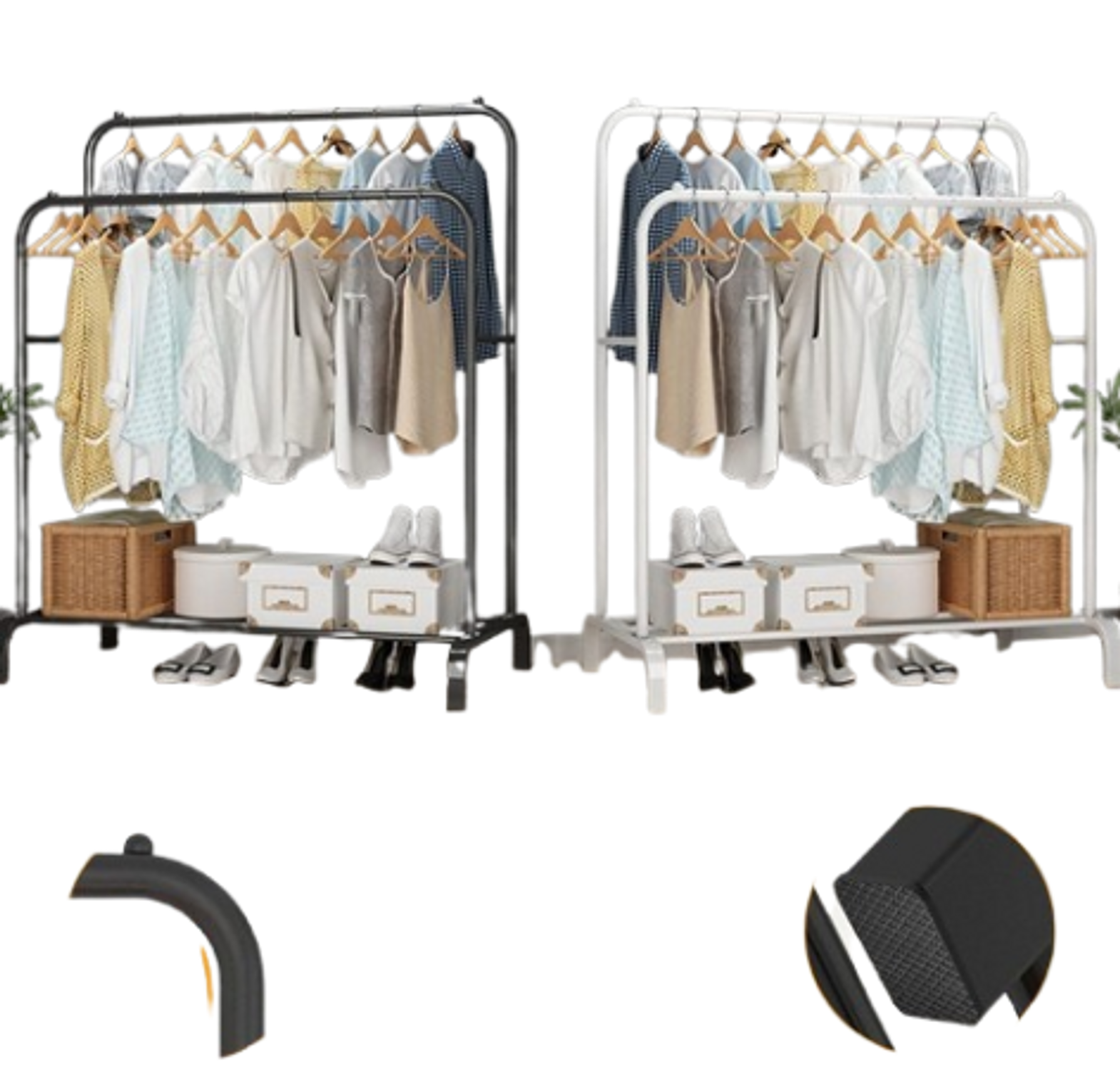Double Pole Multi-functional Clothing Rack, also referred to as a Double Rod Garment Rack or Clothes Rail Rack Heavy Duty Clothes Rack, Double Rods Clothing Racks for Hanging Clothes, Garment Rack with 4 Tier Closet Shelves & 4 Hooks for Clothing Storage, Metal Black Clothing Rack