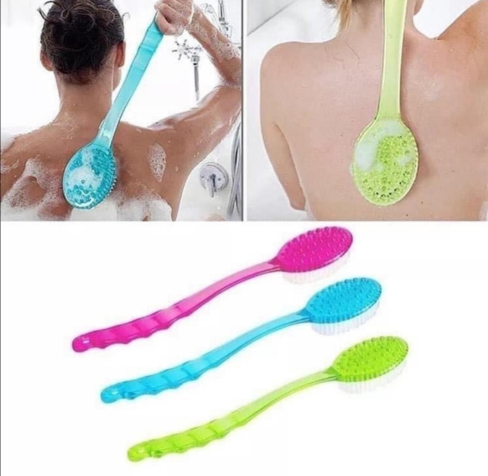 Double sided long handle bath brush 37cm. Features:1. Made of high quality grade silicone material, it is healthy and environmentally friendly, contains no harmful substances, is resistant to high temperature, is not easy to rot, and is safe and durable.2. Suitable for different groups of people, such as children, the elderly, men and women.3. Double-sided lines, with bump design, can effectively bring you a cleansing effect.4. The brush surface is designed with a 1cm thick brush head to deepen the pores to clean dirt.5. Silicone wipes are dry, greatly reducing the survival rate of bacteria.6. Gently rubbing can help you create a lot of foam. This brush will give a stimulating scrub and leaves skin soft, smooth and glowing Great way to wind down after a long day Use it with your favorite bath gel Convenient hanging hole for easy storing You can try to use this long-handled brush massage bath, one side is massage, the other side is intrafamilial transmission A person also can easily clean the back, it is convenient Convex place have massage particles, soft hard are moderate, can effectively promote blood circulation Material: Plastic