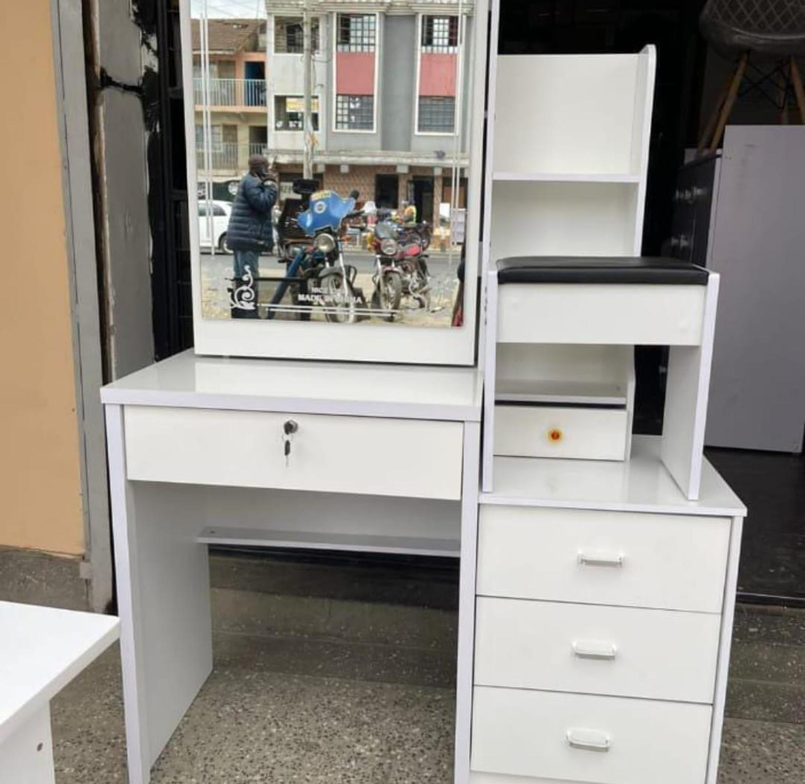 This is a modern and functional piece of bedroom furniture designed for personal grooming and storage. It features a large, central mirror that slides horizontally to reveal hidden storage compartments behind it, perfect for organizing makeup, skincare products, and accessories. The table also includes multiple drawers and open shelves for additional storage of beauty essentials and decorative items