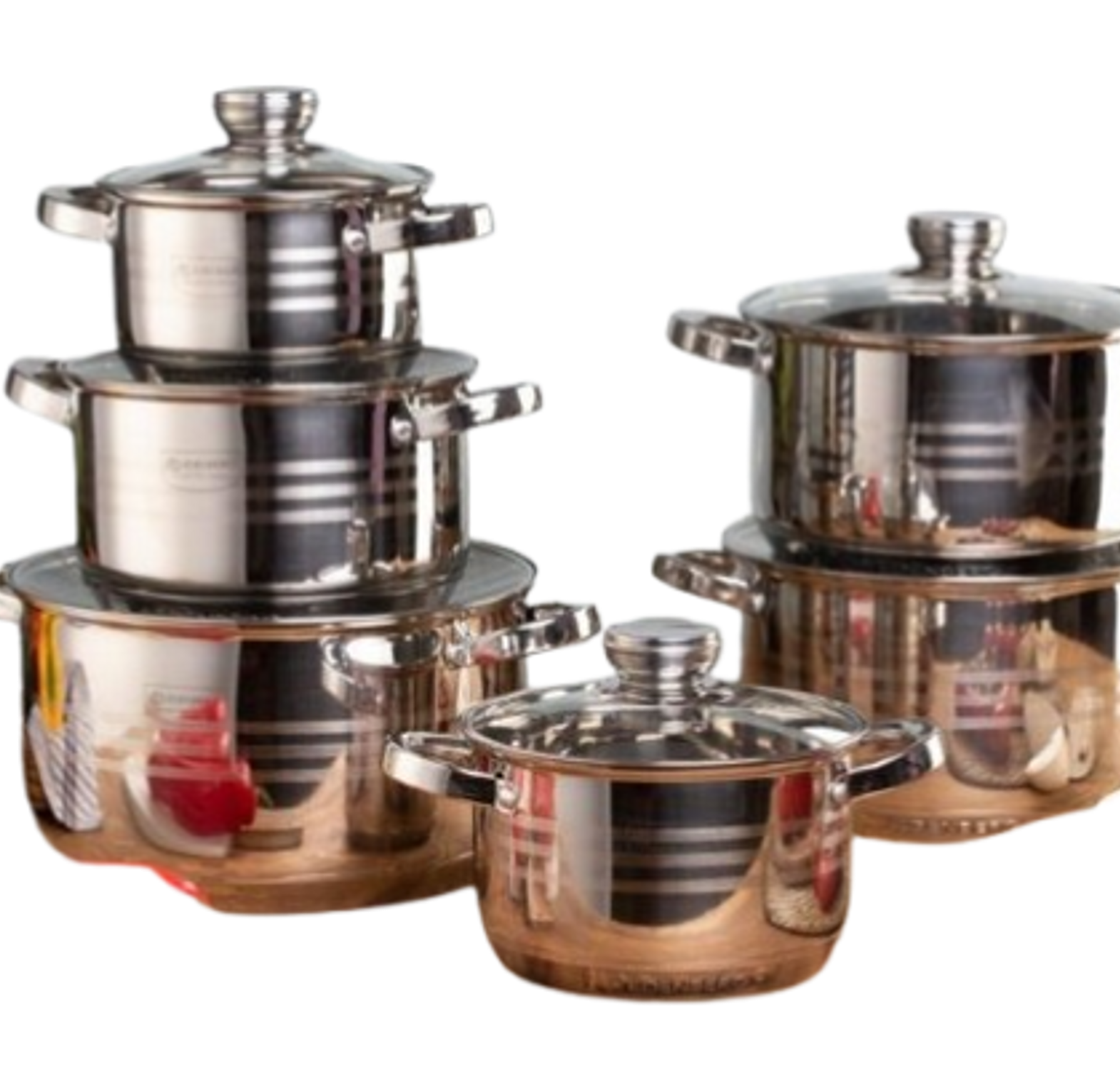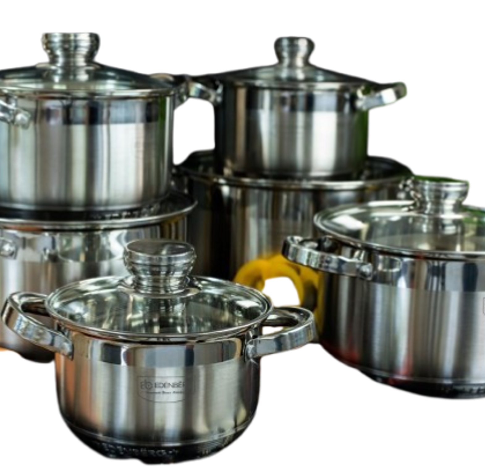 The Edenberg EB-4036 is a comprehensive 12-piece cookware set designed to meet a variety of cooking needs. Crafted from high-quality stainless steel, this set promises durability, even heat distribution, and a sleek, professional look for your kitchen. The set includes an assortment of saucepans, stockpots, and a frying pan, all equipped with sturdy, riveted handles for a secure grip. The pots come with tight-fitting lids, many of which are made of tempered glass, allowing you to monitor your cooking without losing heat or moisture. The stainless steel construction is not only robust but also ensures compatibility with all stovetops, including induction. This cookware is designed for ease of use and cleaning, making it a practical choice for both novice and experienced cooks. The polished finish adds an elegant touch to your kitchen decor, while the variety of sizes caters to different cooking tasks, from simmering sauces to boiling pasta