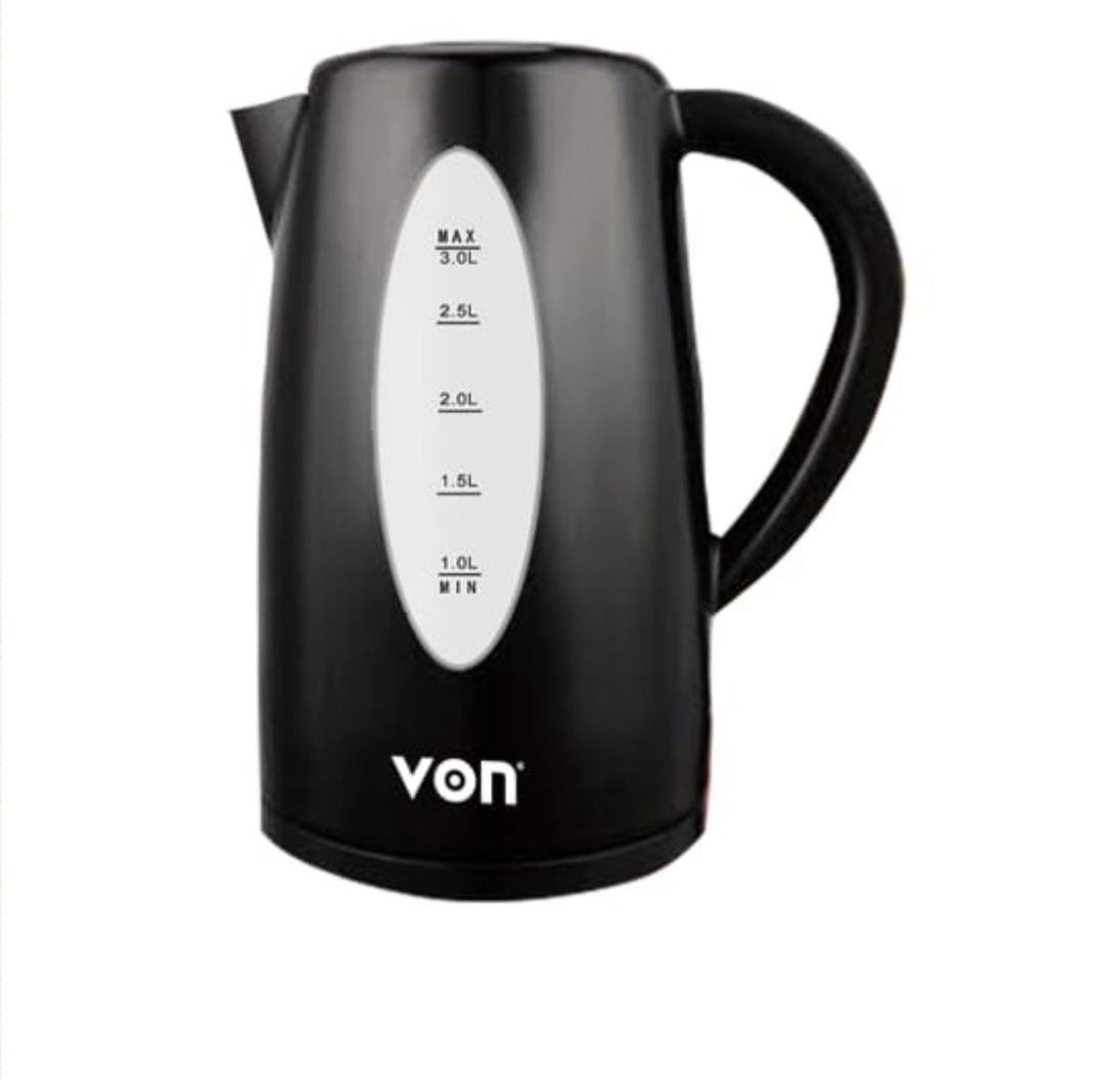 360 degree rotational plastic kettle Colour - Black Capacity: 3.0L 2200W Safety lock lid and open lid automatically Boil dry protection Automatically turns off when water boils Cord storage Concealed heating element Anti-slip feet design