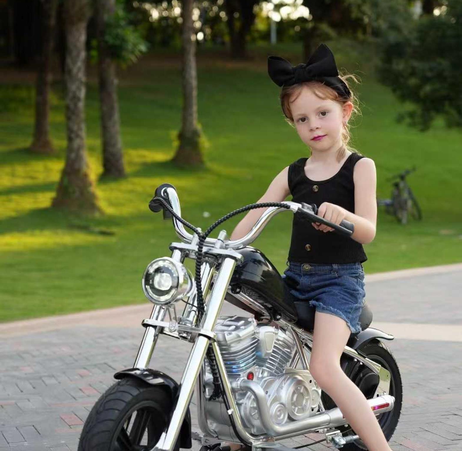 It is a children's ride-on toy designed with vintage chopper styling but incorporating modern features. The motorcycle includes interactive elements such as a built-in Bluetooth speaker for music, LED lights, and simulated fog effects for an immersive riding experience. It is constructed with a durable high-carbon steel frame and 12x3 inch all-terrain tires suitable for various surfaces.