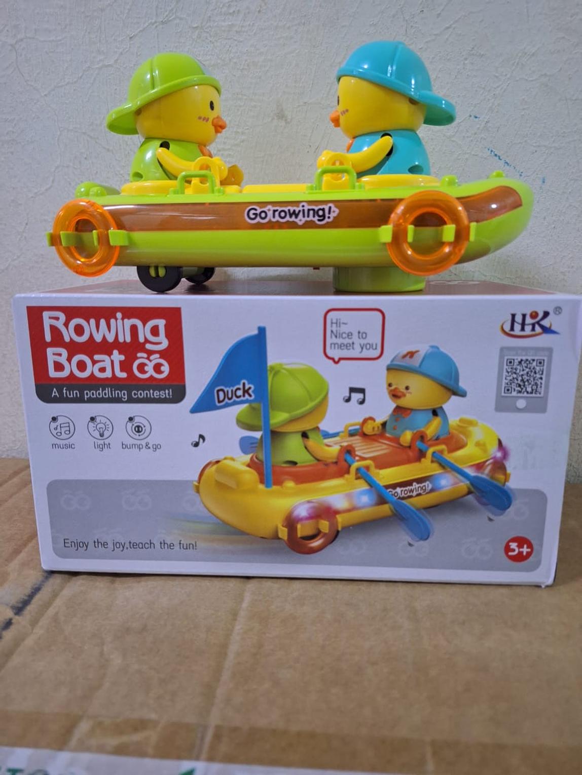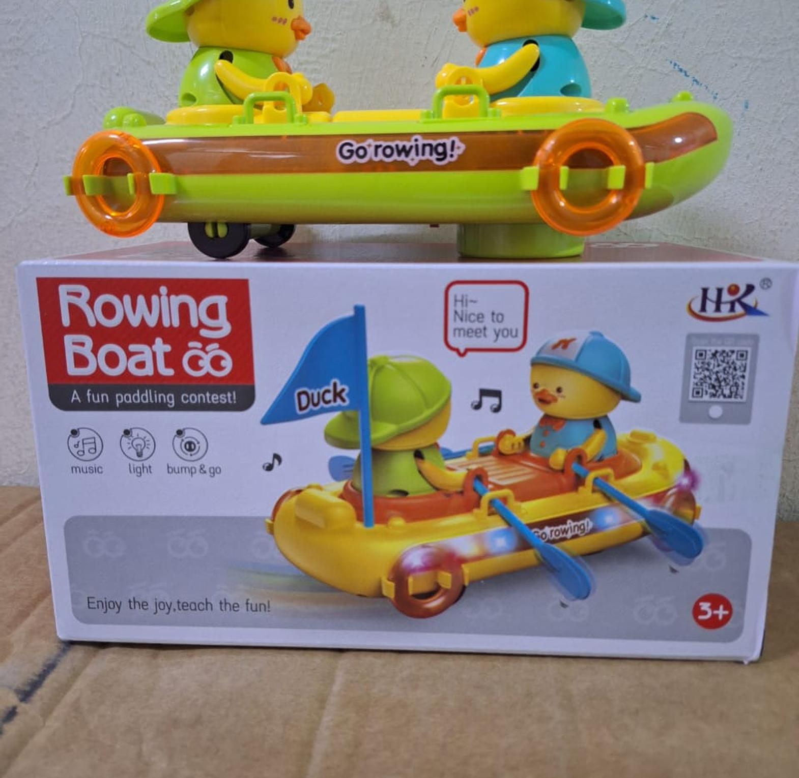 This interactive toy features two adorable duck figures in a boat with paddles, designed to mimic realistic rowing movements. It often includes colorful flashing lights and engaging music for an exciting playtime experience. The toy is typically battery-operated, allowing for smooth movement and endless entertainment.